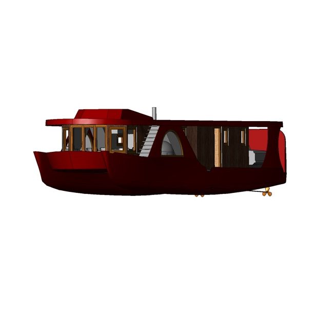 Le catamaran est équipé d’un carré qui fait office de séjour et de cuisine, deux cabines, un wc, une douche et une baignoire, une grande terrasse sur le toit et une petite à l’avant. Une plage arrière et un emplacement pour une toute petite voiture. Chauffage au bois et fioul.