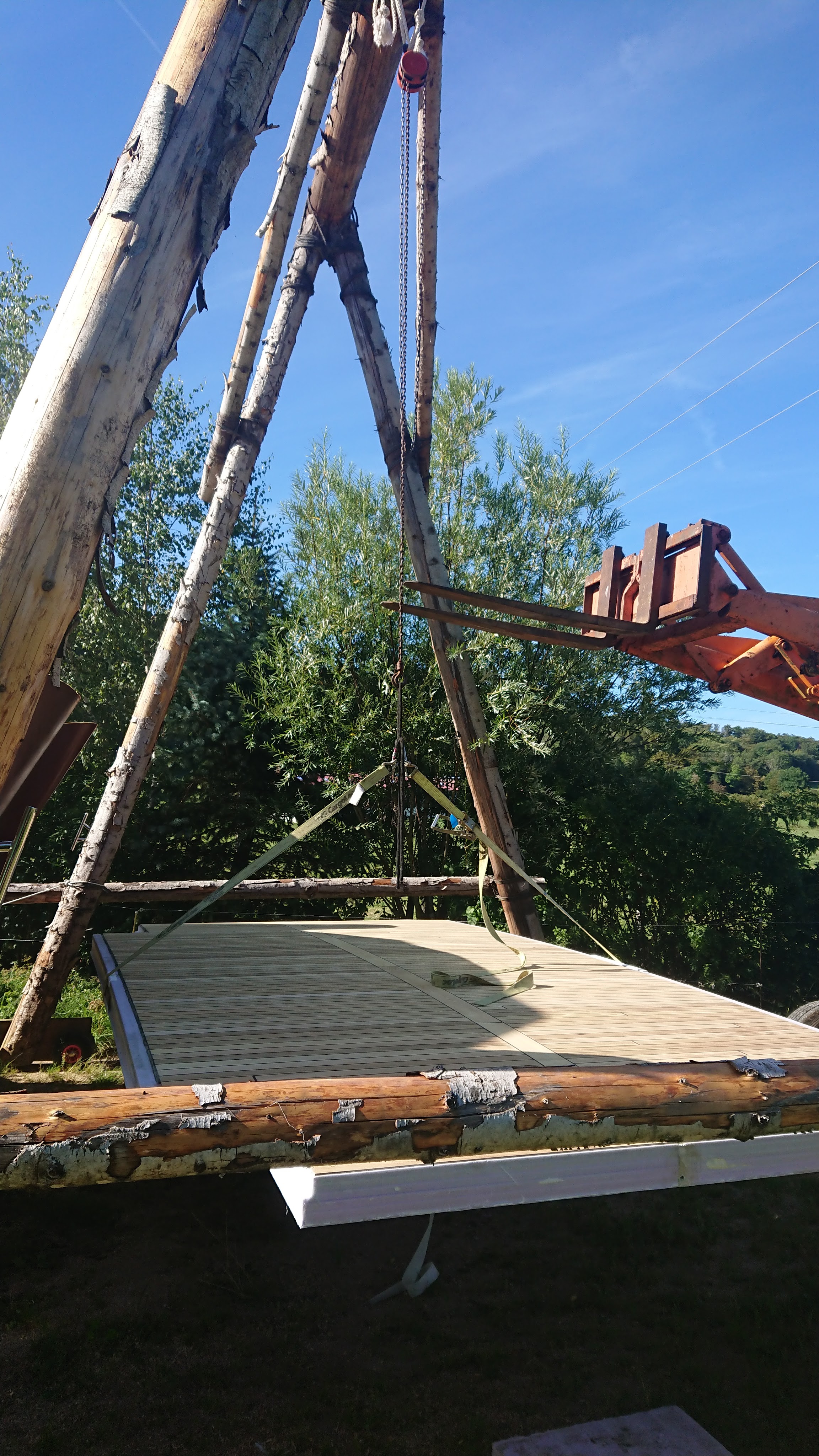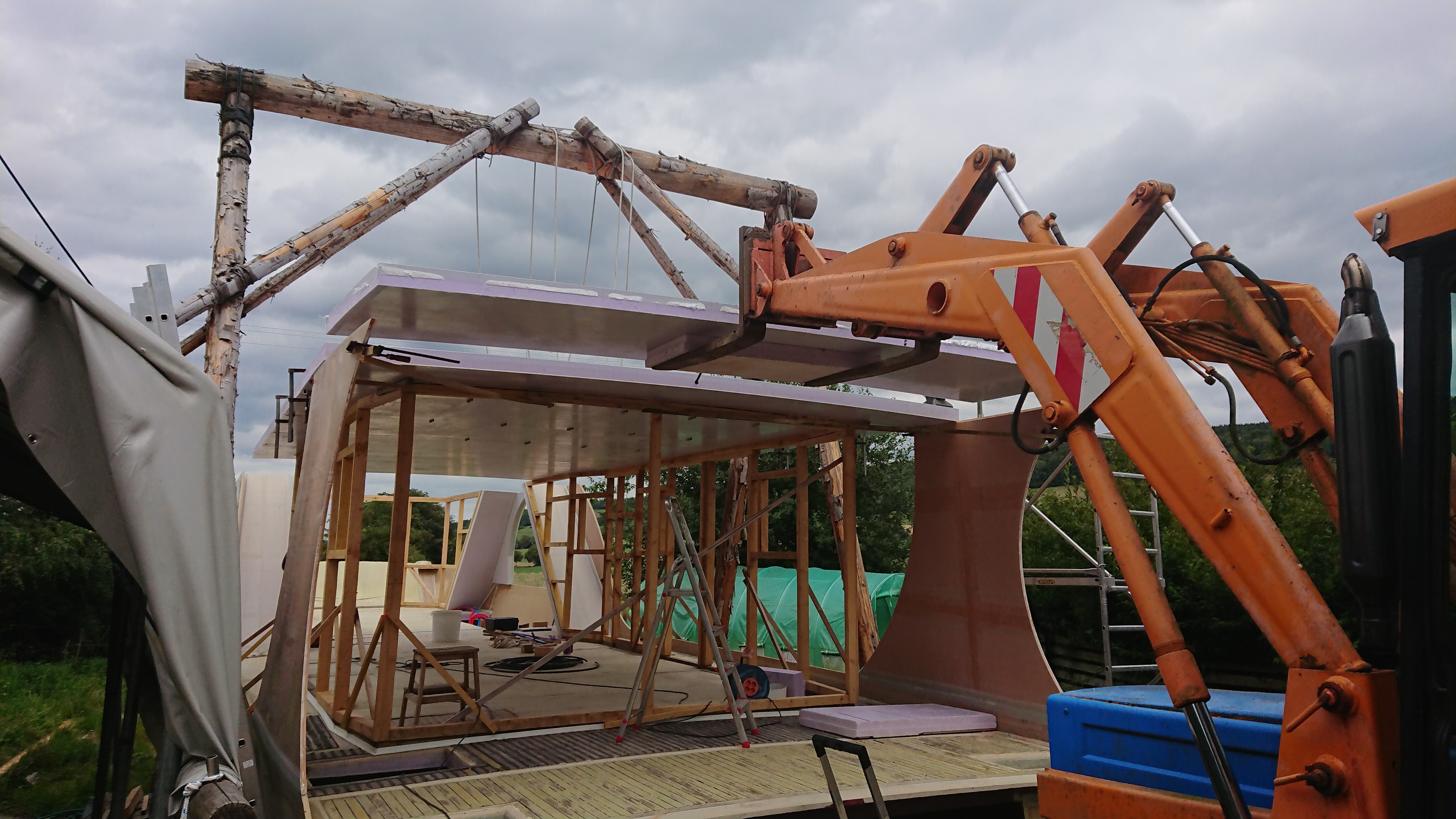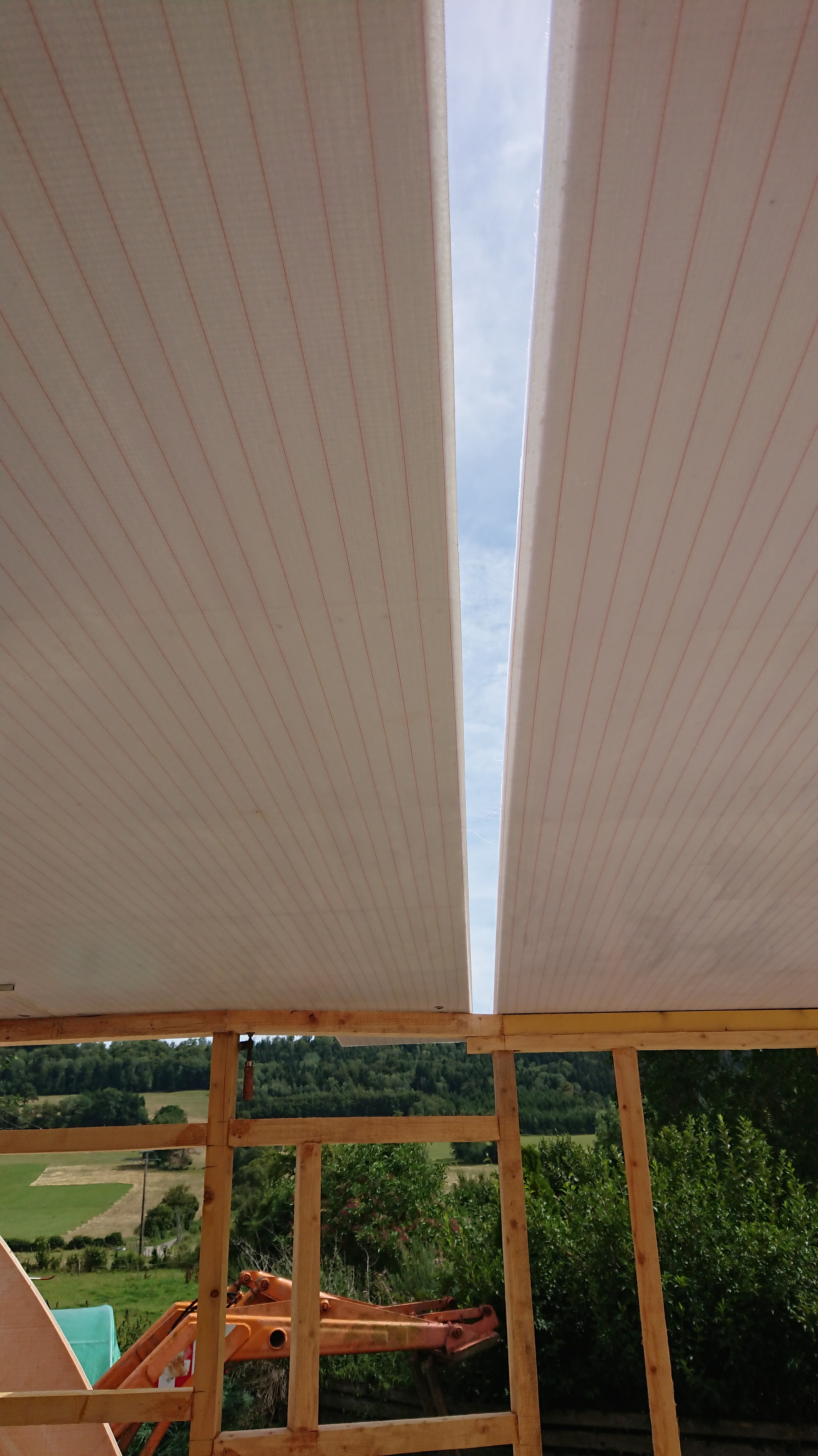 Nos travaux de collage terminés, on peut maintenant continuer à poser le toit. Les deux éléments suivants mesurent 2,20 m sur 4,60 m et le troisième est encore plus grand. Ils ne sont pas transportables à bras d’homme (ni de femme, d’ailleurs) et nous avons recours au tracteur et à la grue pour les poser.