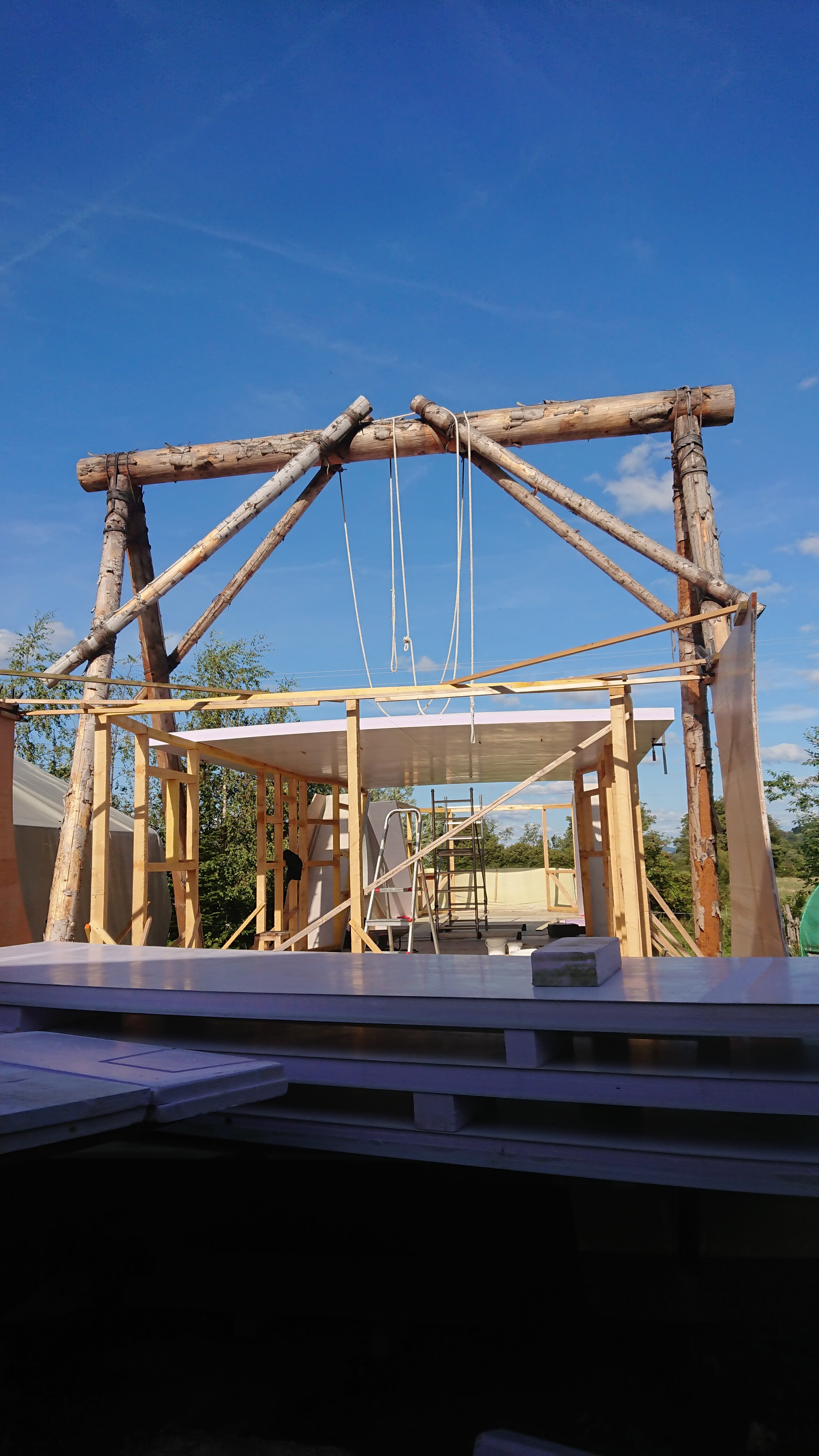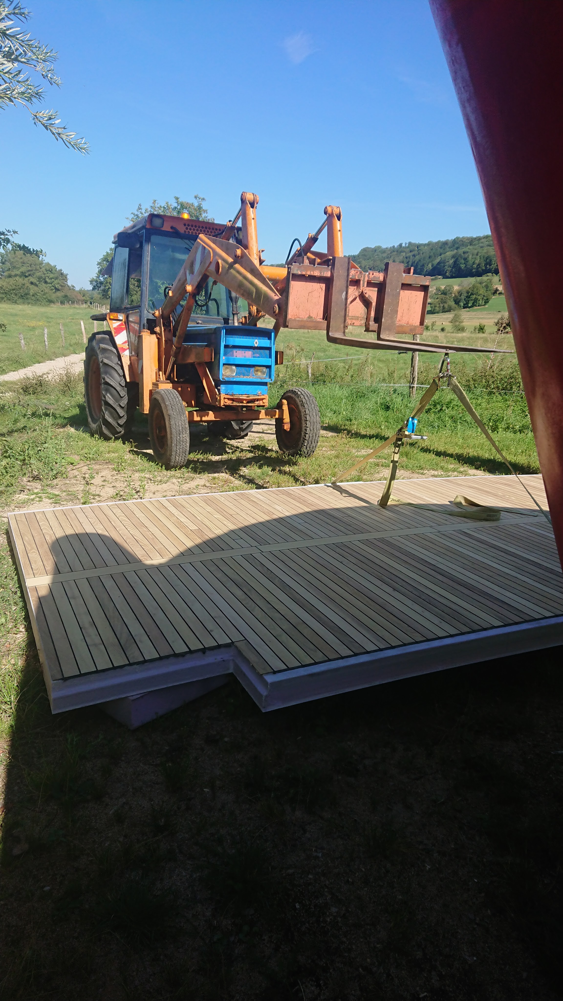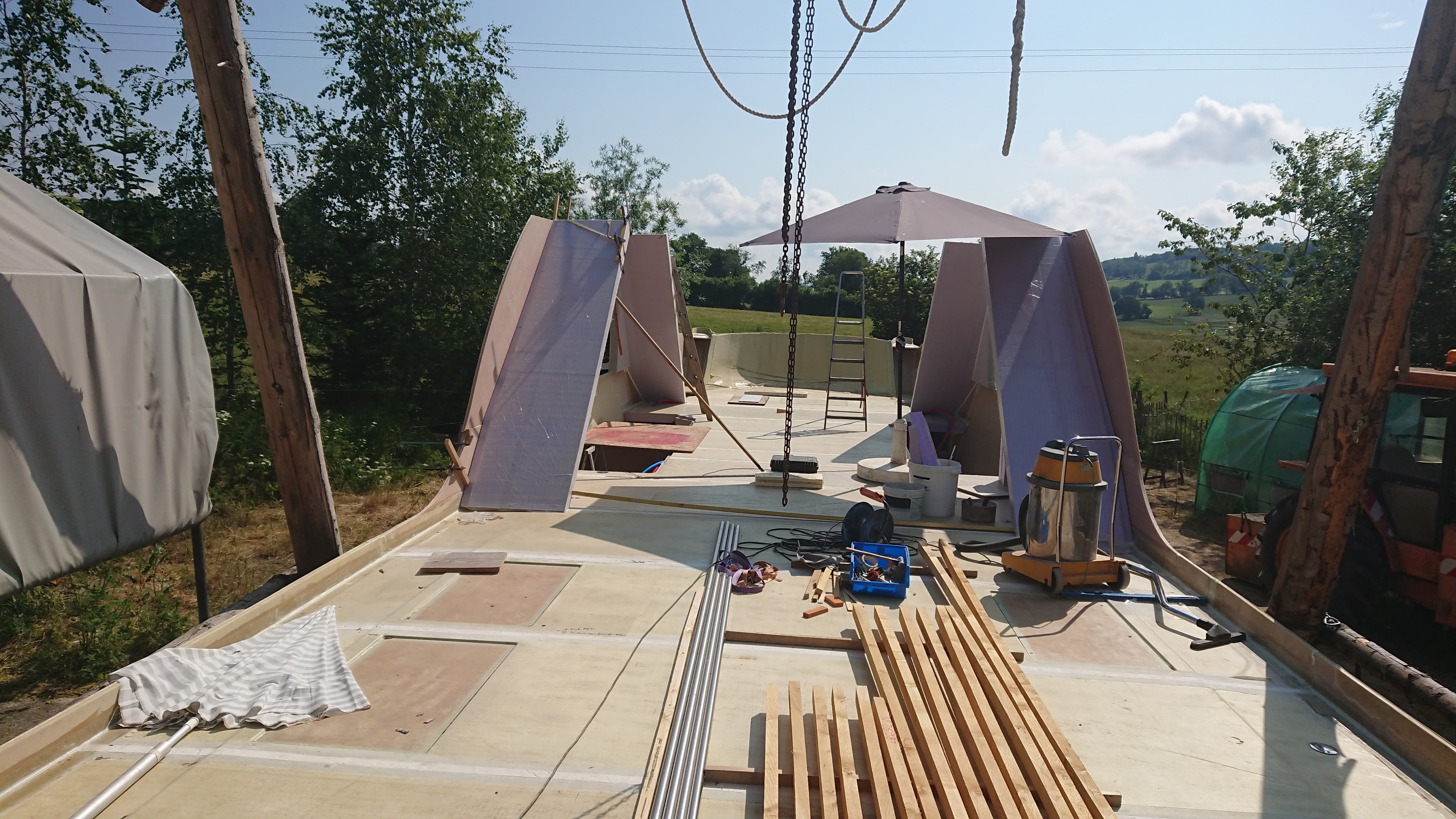 Nos travaux de collage terminés, on peut maintenant continuer à poser le toit. Les deux éléments suivants mesurent 2,20 m sur 4,60 m et le troisième est encore plus grand. Ils ne sont pas transportables à bras d’homme (ni de femme, d’ailleurs) et nous avons recours au tracteur et à la grue pour les poser.