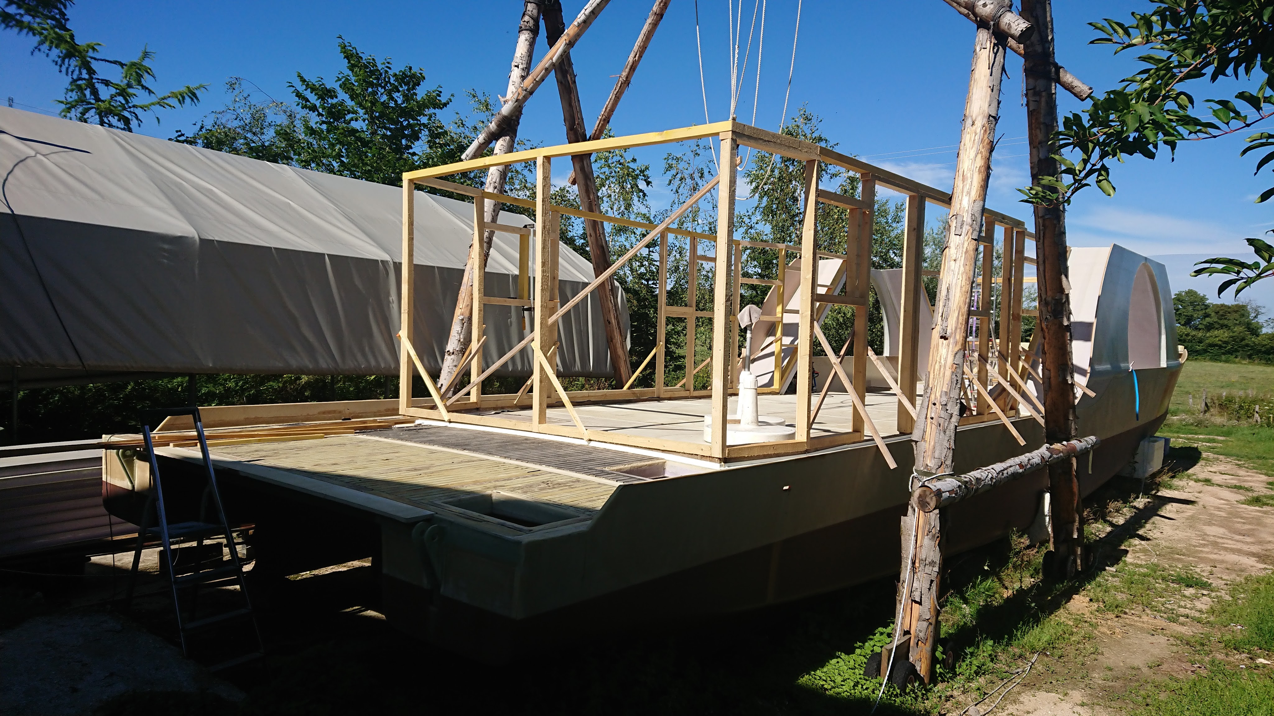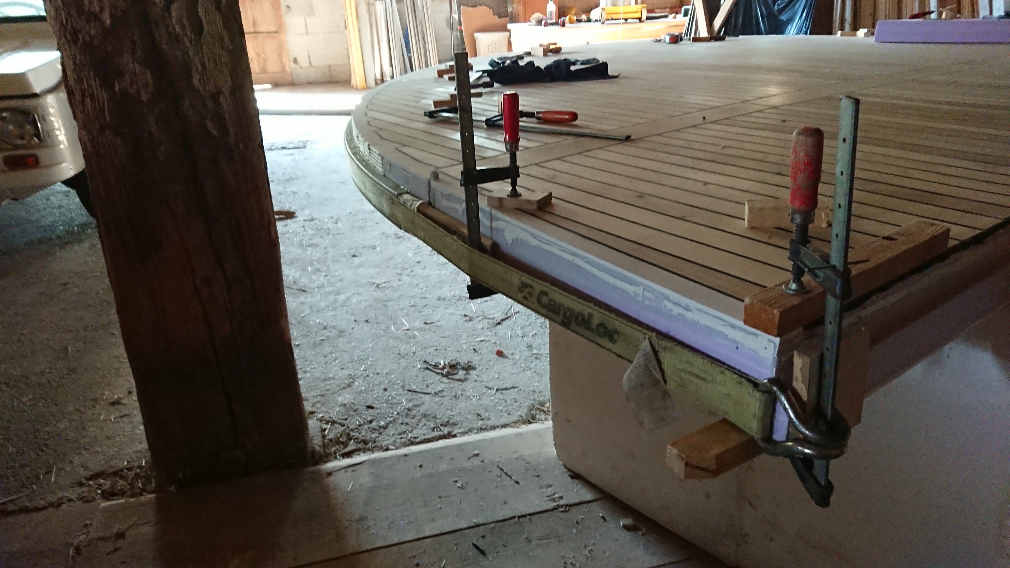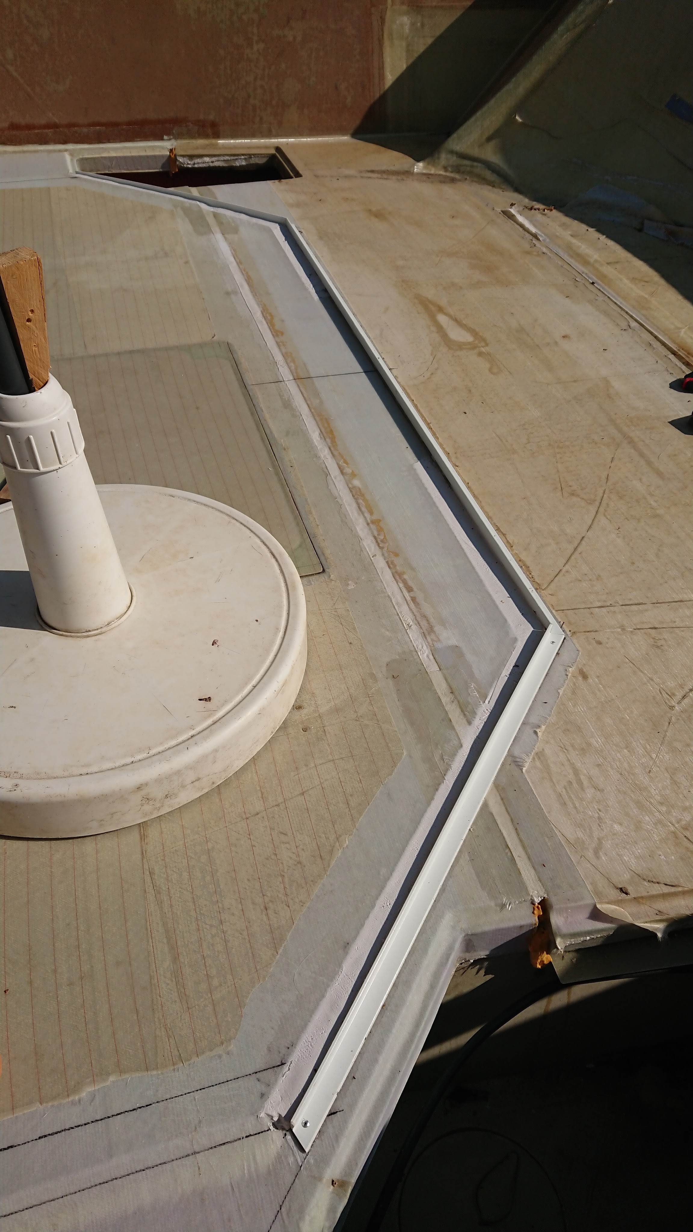 Avant de commencer la charpente, nous collons un profilé en L en polyester sur le pont. Les rivets ne servent qu’à le tenir en place le temps que le mastic (époxy + coton) durcisse. Le profilé va assurer la tenue des poutrelles en chêne et servira de renvoi d’eau par la suite. Pour l’instant, il donne une vague idée de l’emplacement de la future habitation.