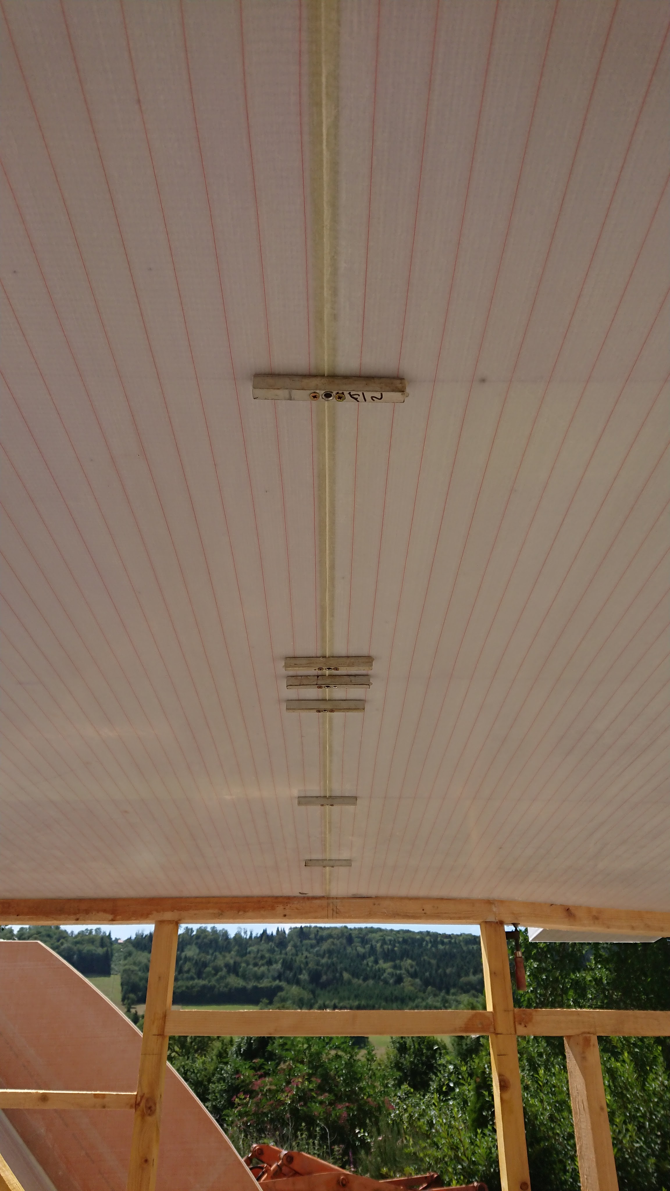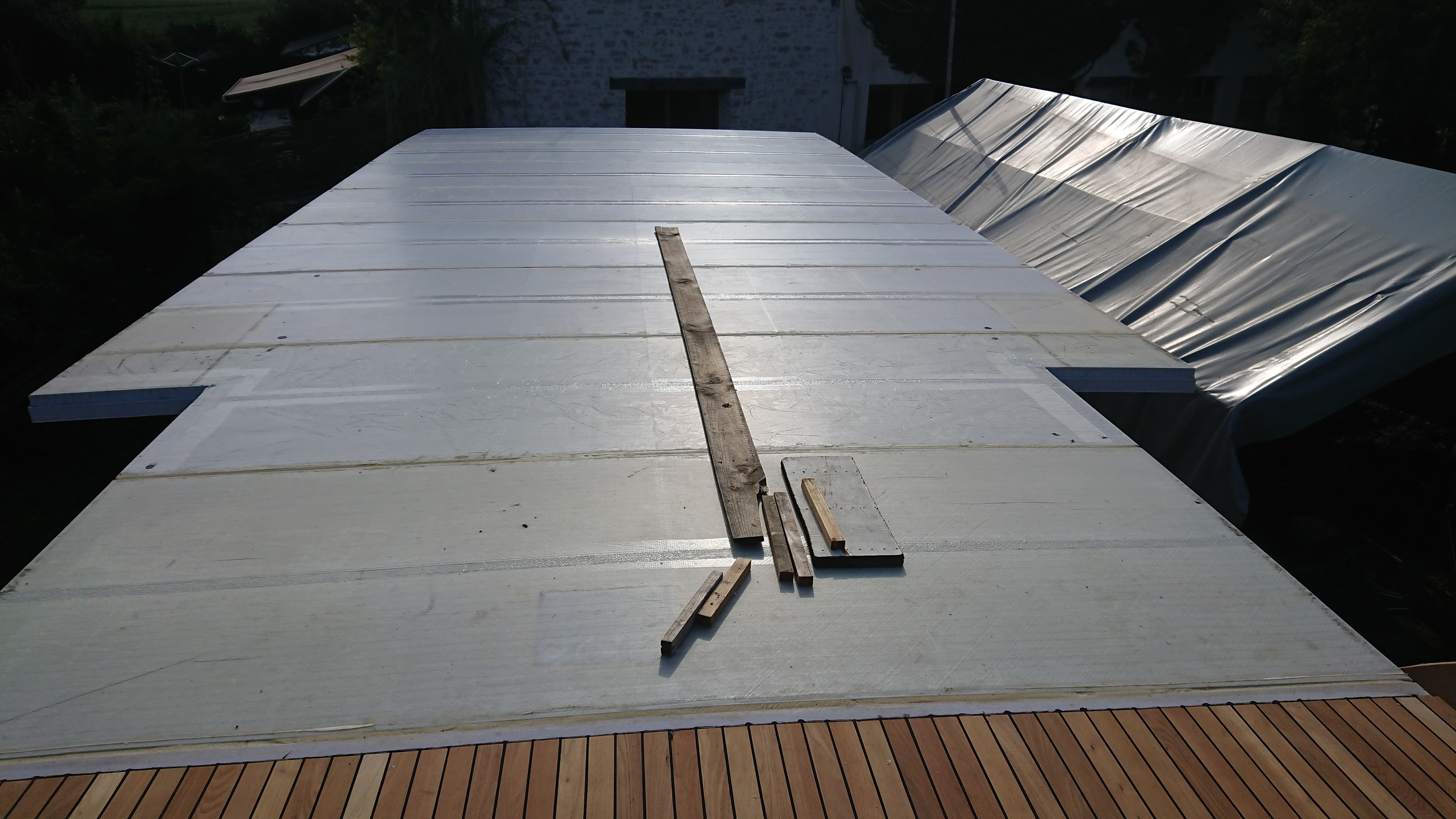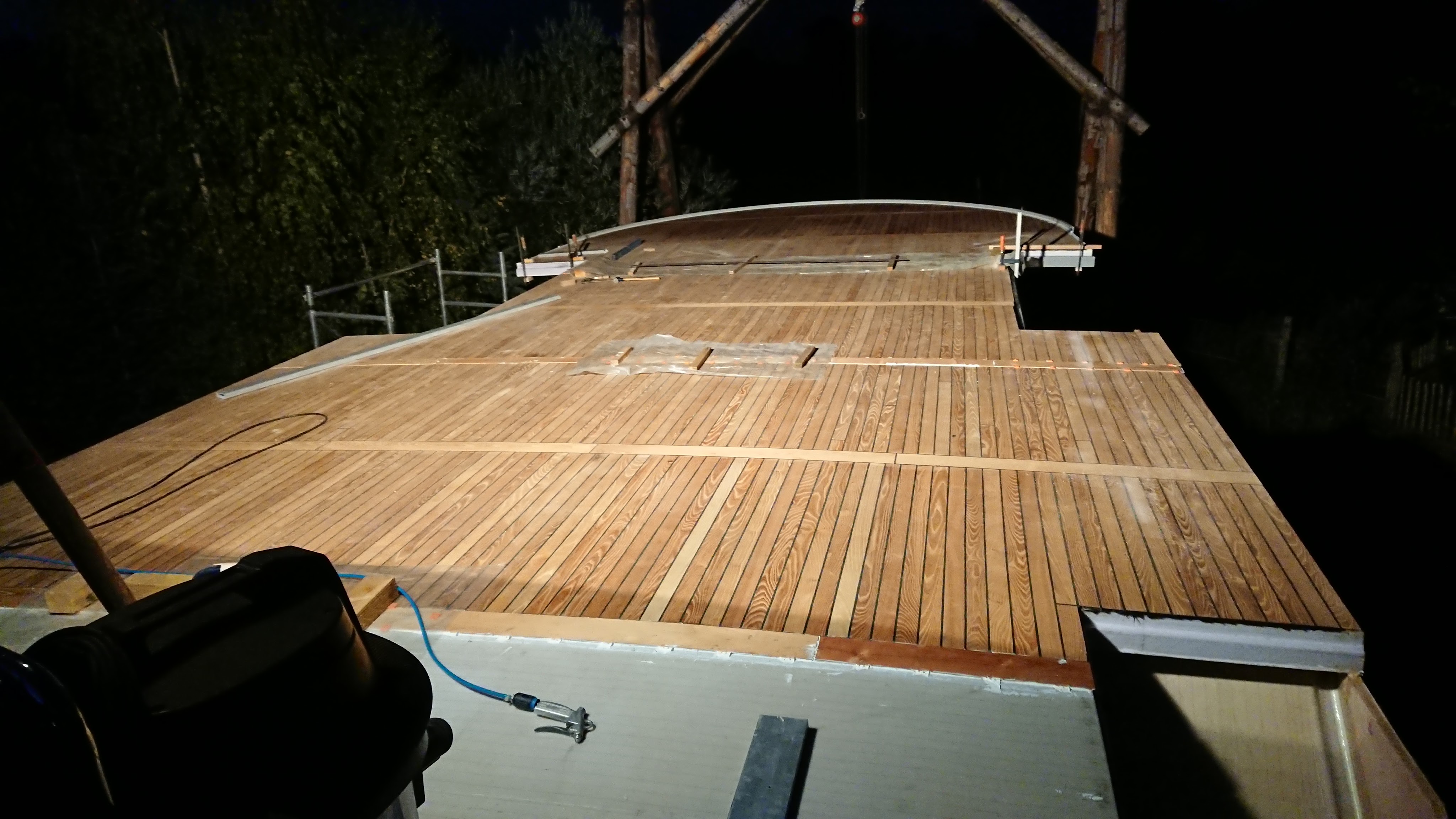 Le 17 août 2023, c’est à dire avec pratiquement un mois et demi d’avance sur le planning, le dernier élément du toit est collé! Il va sans dire que pour arriver à cette prouesse, nous avons travaillé d’arrache pied. Bien évidement, il reste quelques bricoles à faire pour affirmer qu’il est terminé.