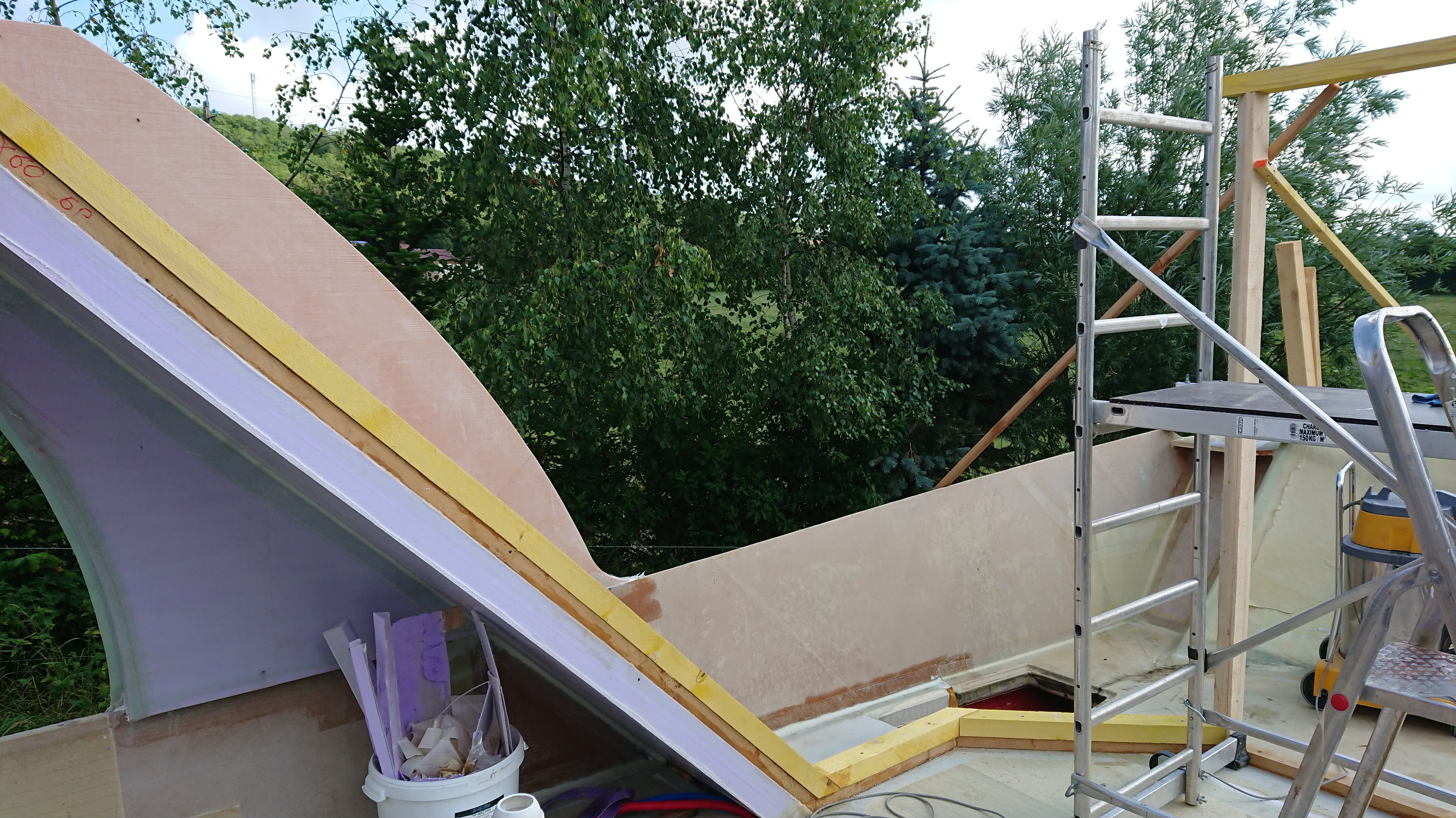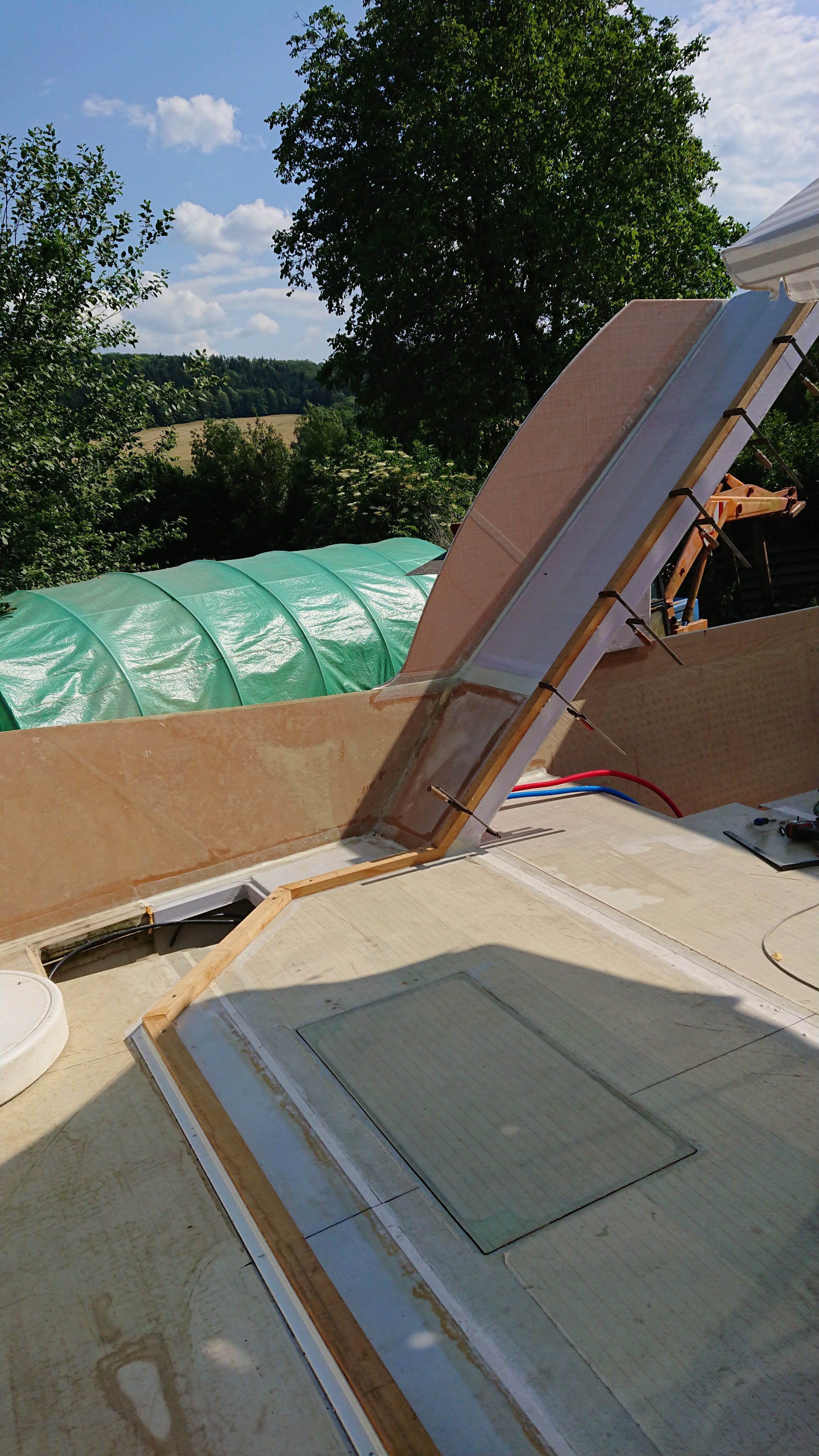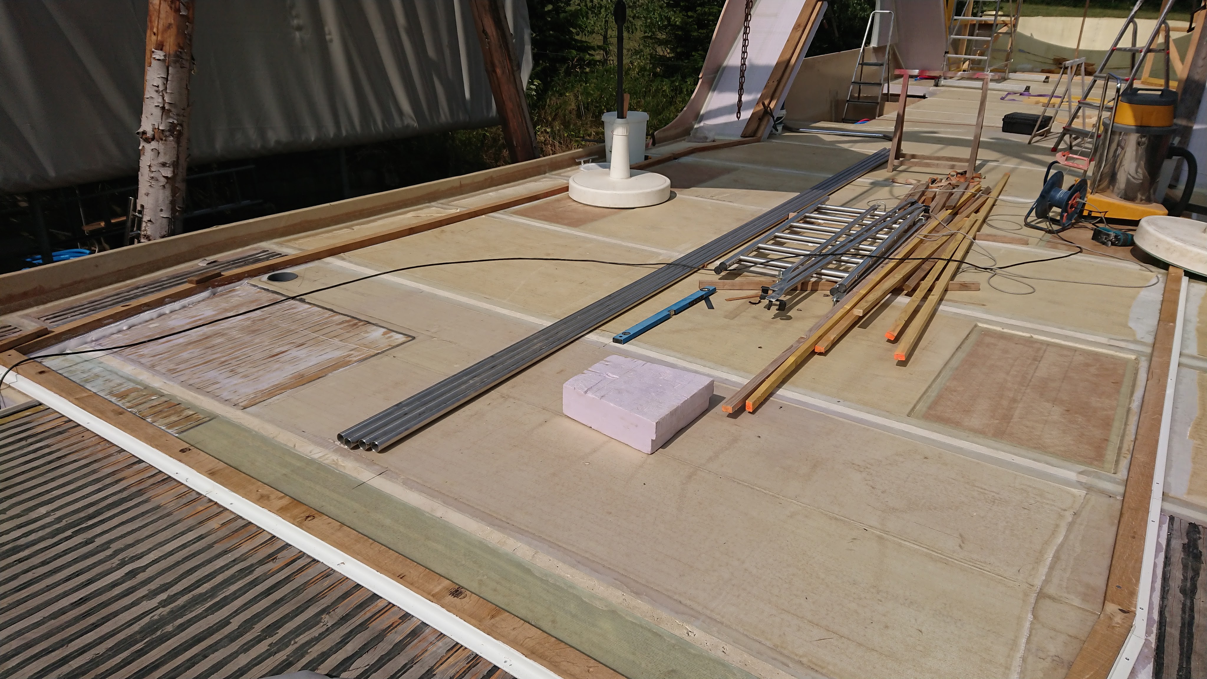 Le 17 août 2023, c’est à dire avec pratiquement un mois et demi d’avance sur le planning, le dernier élément du toit est collé! Il va sans dire que pour arriver à cette prouesse, nous avons travaillé d’arrache pied. Bien évidement, il reste quelques bricoles à faire pour affirmer qu’il est terminé.