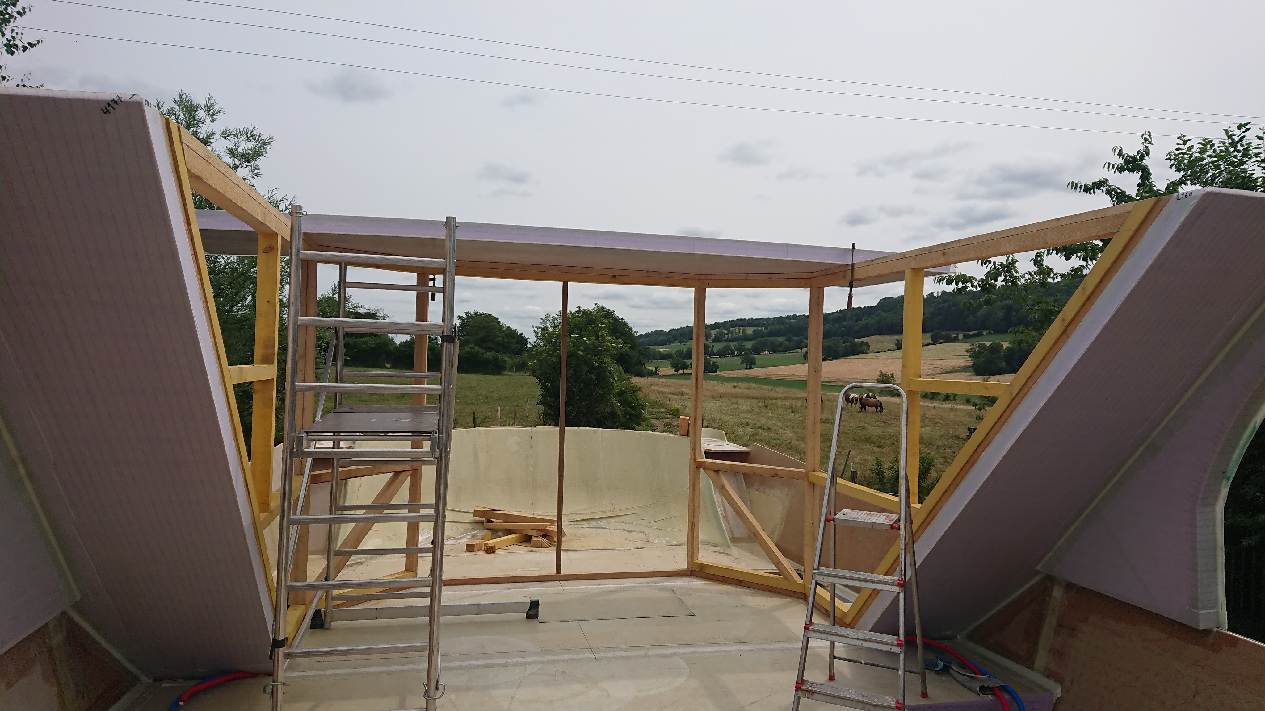 La charpente est pratiquement terminée. Pour pouvoir circuler plus facilement pendant les travaux, les décharges et autres entretoises qui manquent encore seront montées juste avant de poser le lambris.