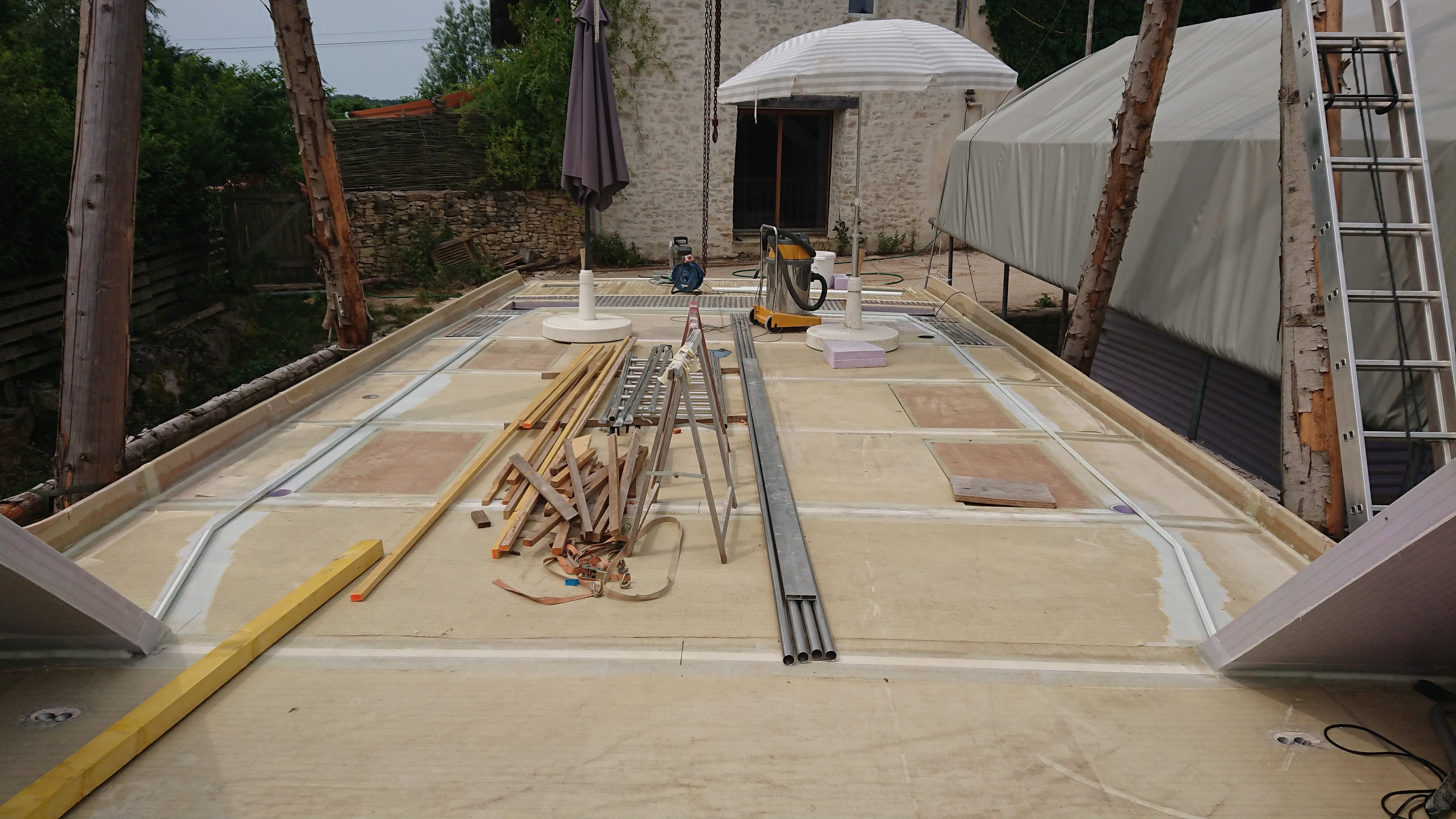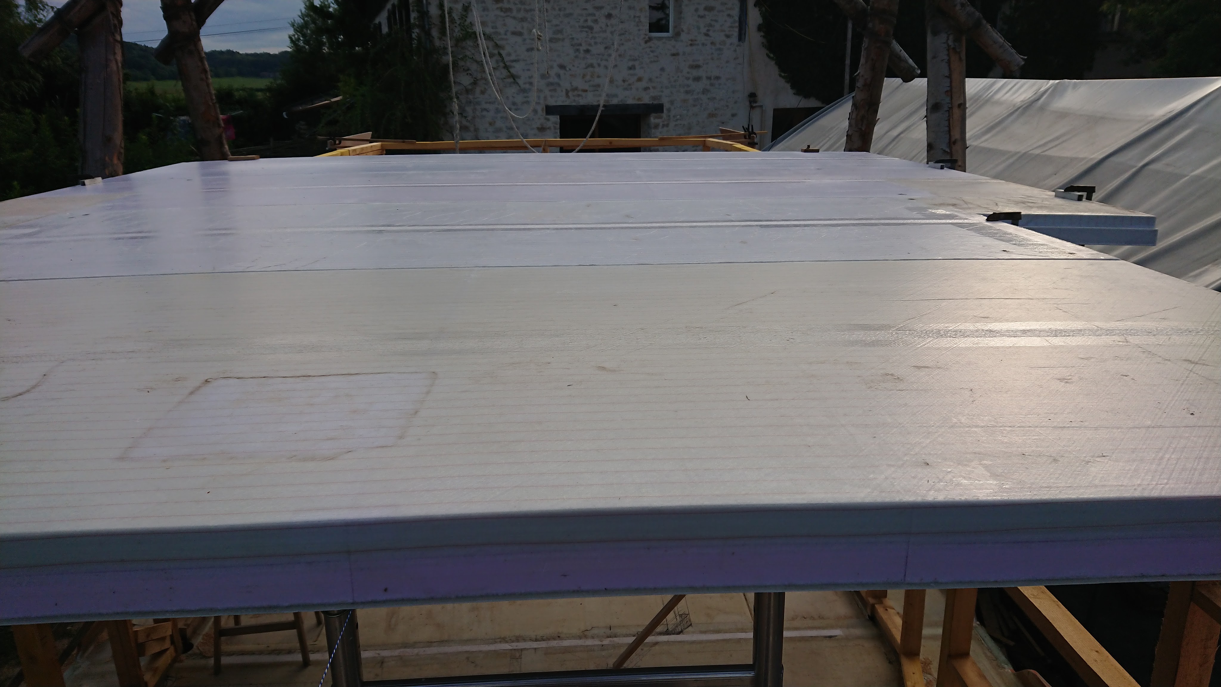 Pour que le toit soit réellement terminé, il faut encore finir de poser les bordures, poncer les joints PU, lisser les jointures entre les éléments avec du mastic fin et mettre une ou deux couche d’époxy sur toute la surface arrière pour que ce soit bien étanche avant de peindre au polyuréthane bi composant. Il faut savoir que le polystyrène a la fâcheuse tendance à fondre au contact de cette peinture quand elle est liquide.