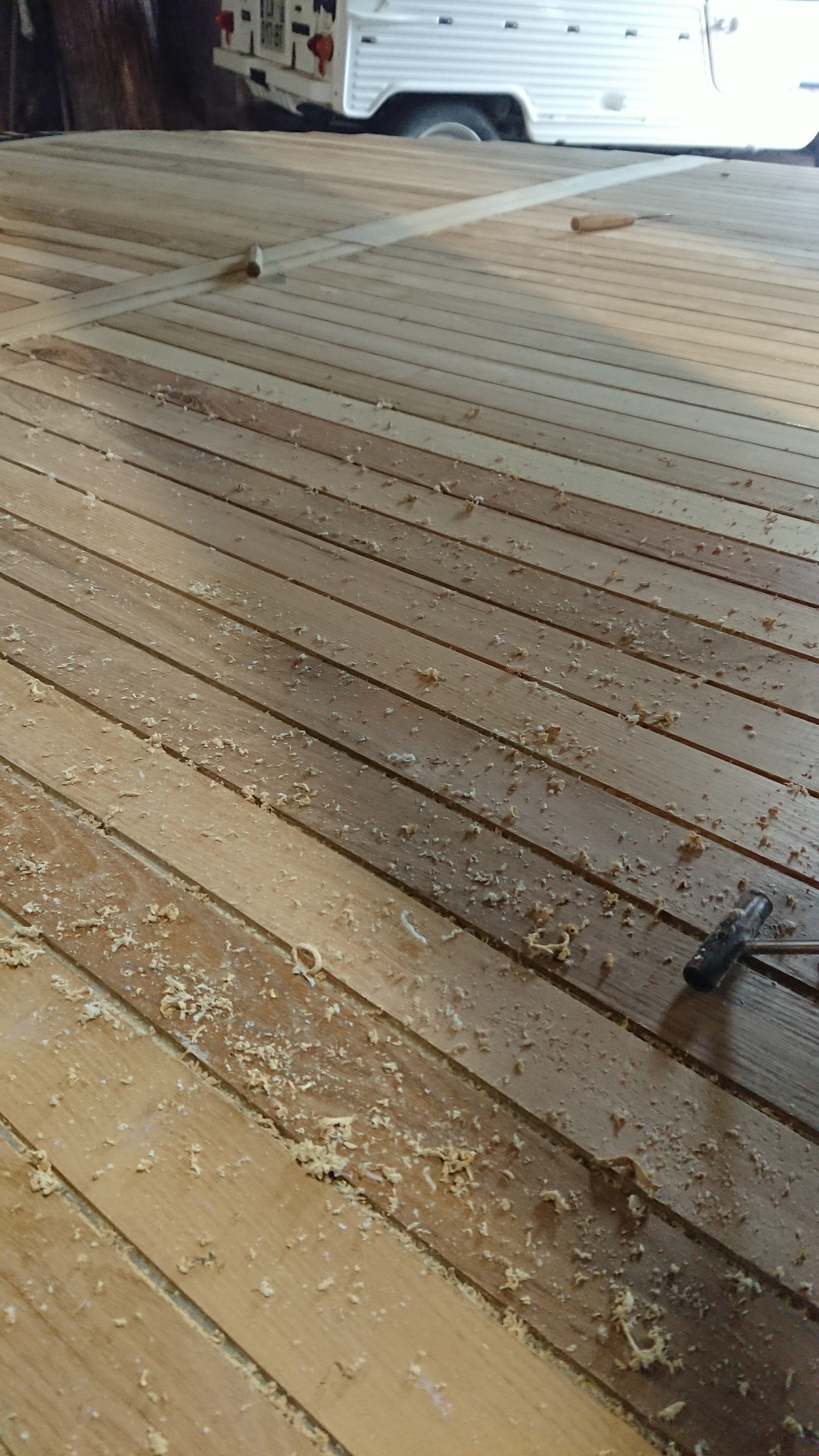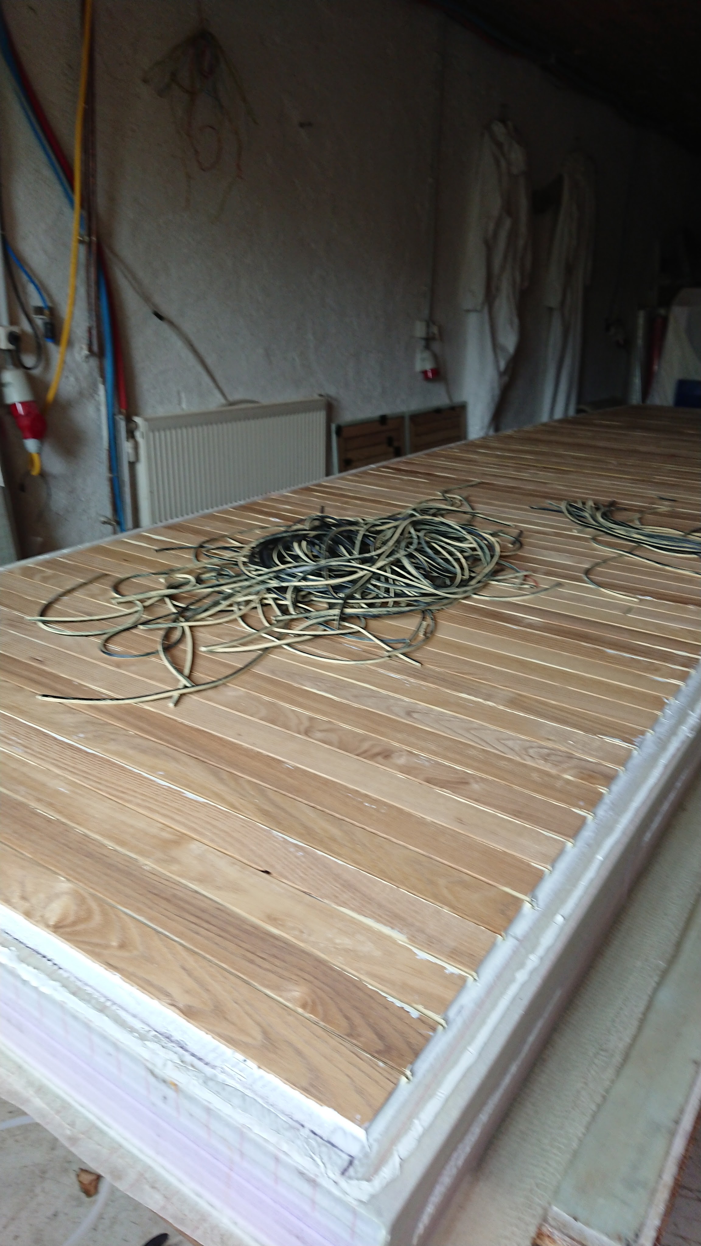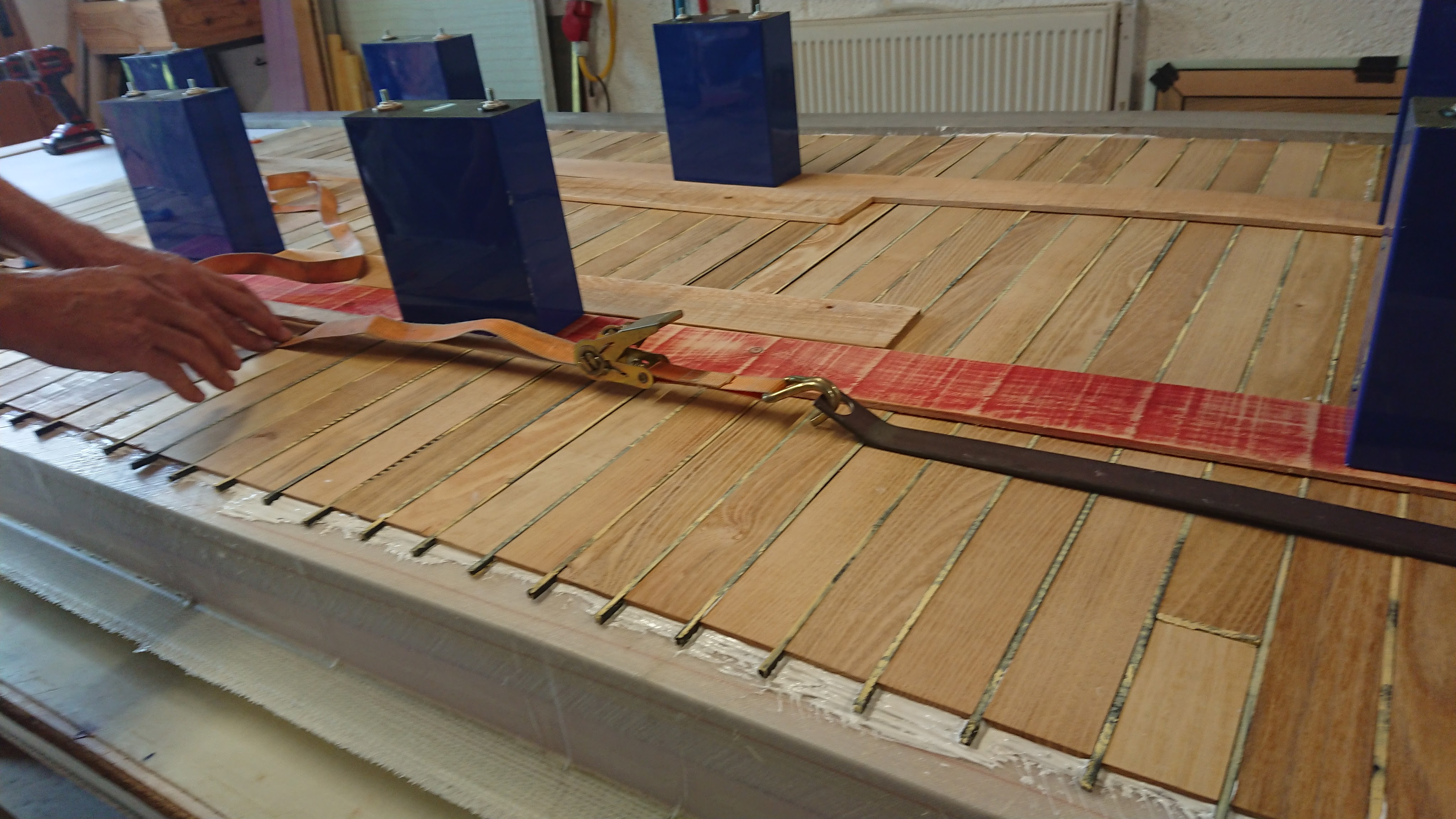 Les poutrelles en chêne sont horriblement tordues et ne sont pas utilisables en l’état. Elles sont tout d’abord, immergées dans l’eau pendant 24 heures, et séchées sous contrainte. Une fois bien droites et sèches, elles sont collées sur le pont et contre le profilé en L avec le même mastic que précédemment.
