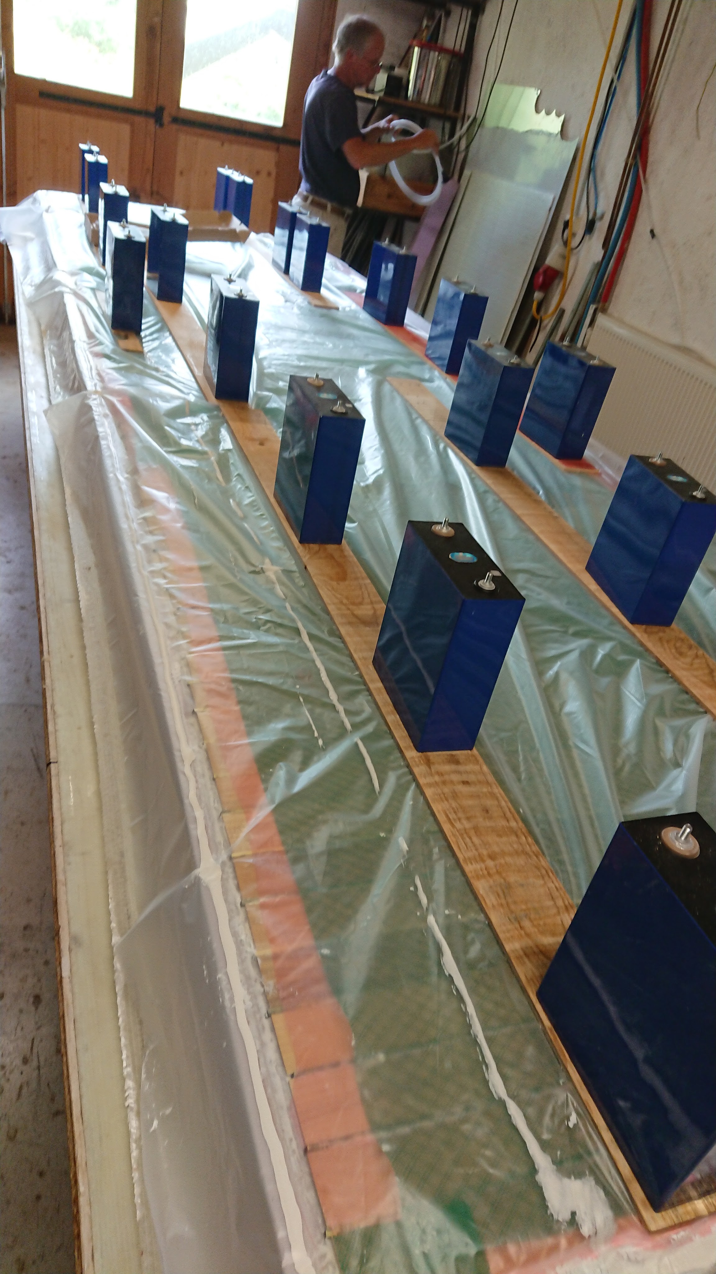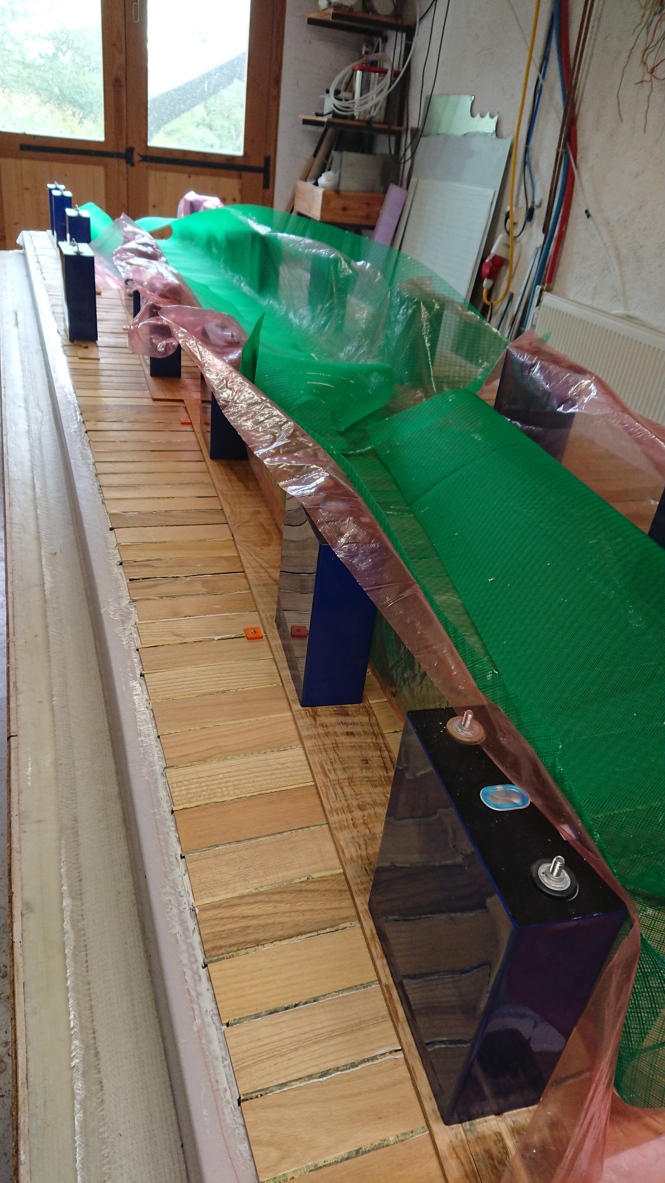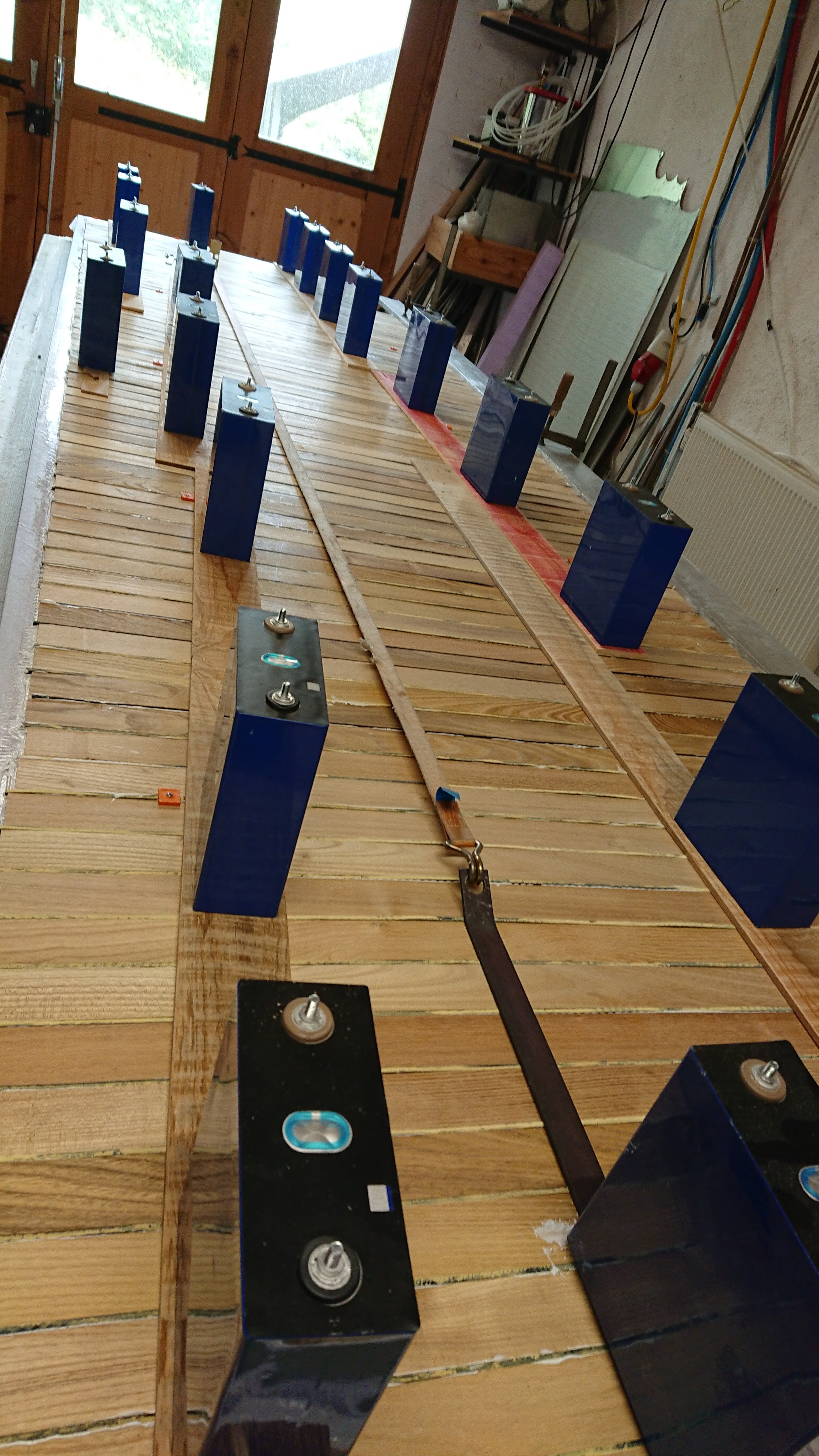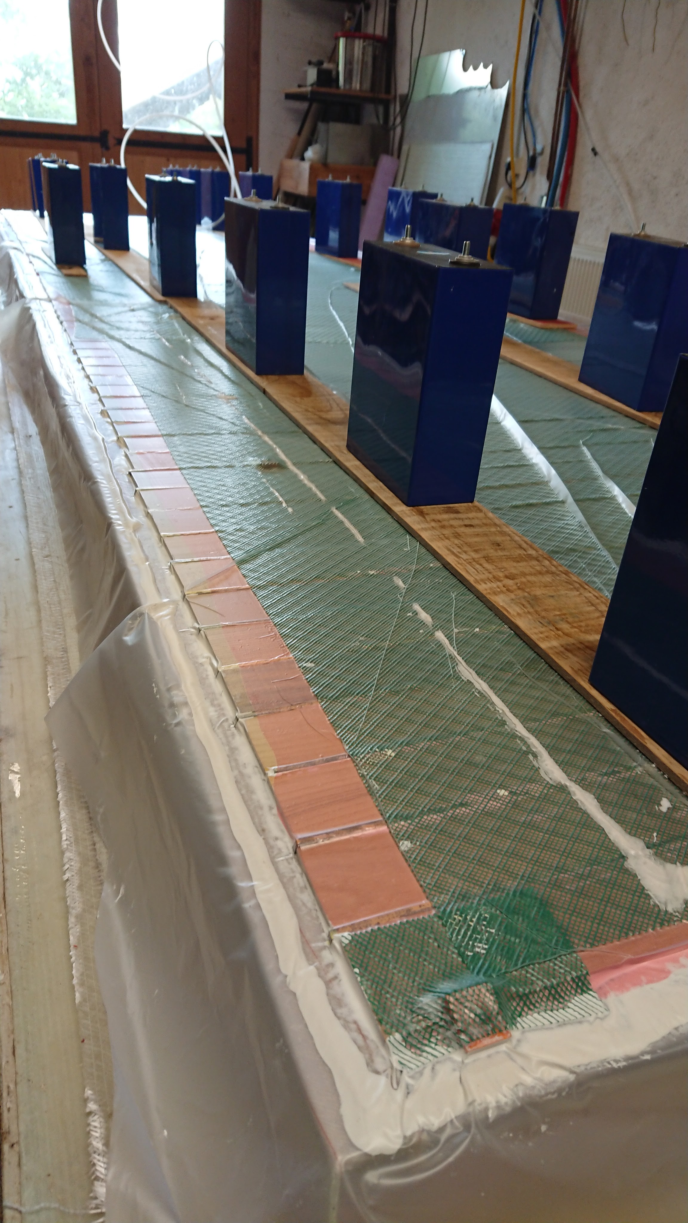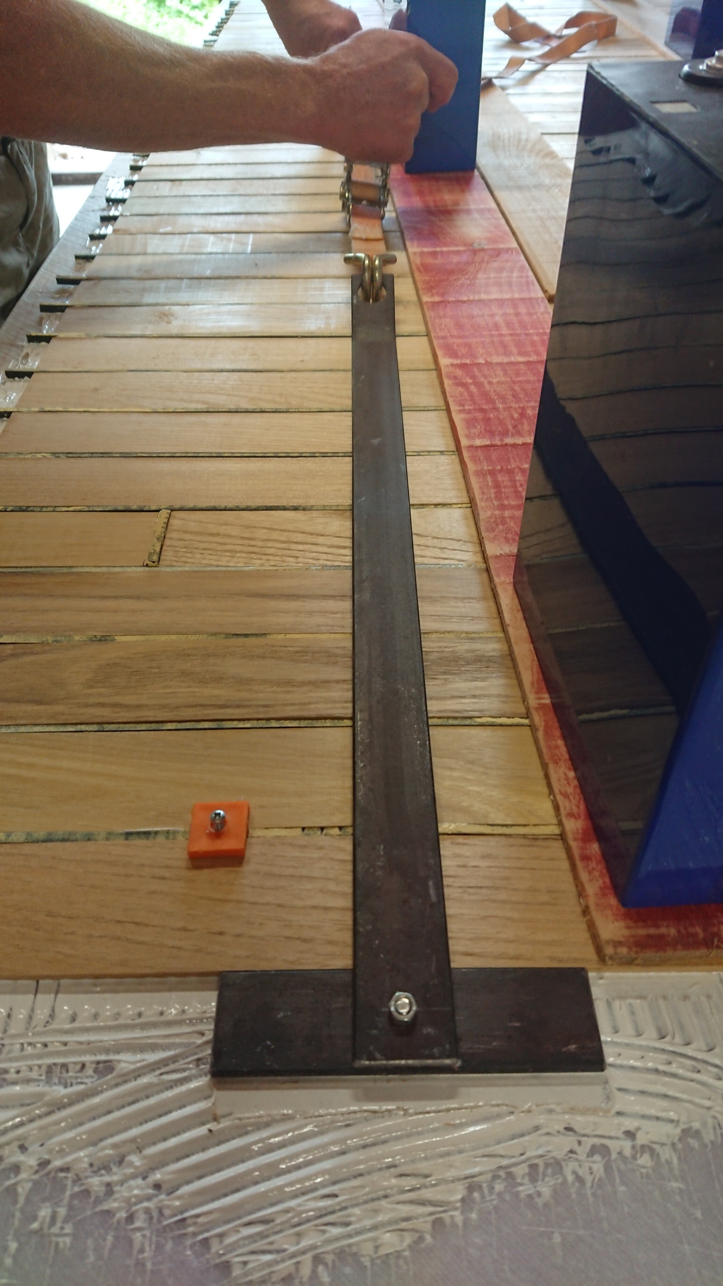 Après avoir étalée la colle, nous posons les lames, avec entre elles, une petite bande en caoutchouc de 4 mm de largeur. Le tout est lesté avec les batteries que nous avons, heureusement déjà achetées. Quand une trentaine de lames sont posées, nous les pressons les unes contre les autres avec un outil « inventé » pour l’occasion. On visse quelques petites cales en plastique aux extrémités pour que les lames gardent leurs positions et on continue de poser les lames et le caoutchouc jusqu’aux bords de la pièce. On compresse bien et on visse les dernières petites cales pour que tout reste bien en place.