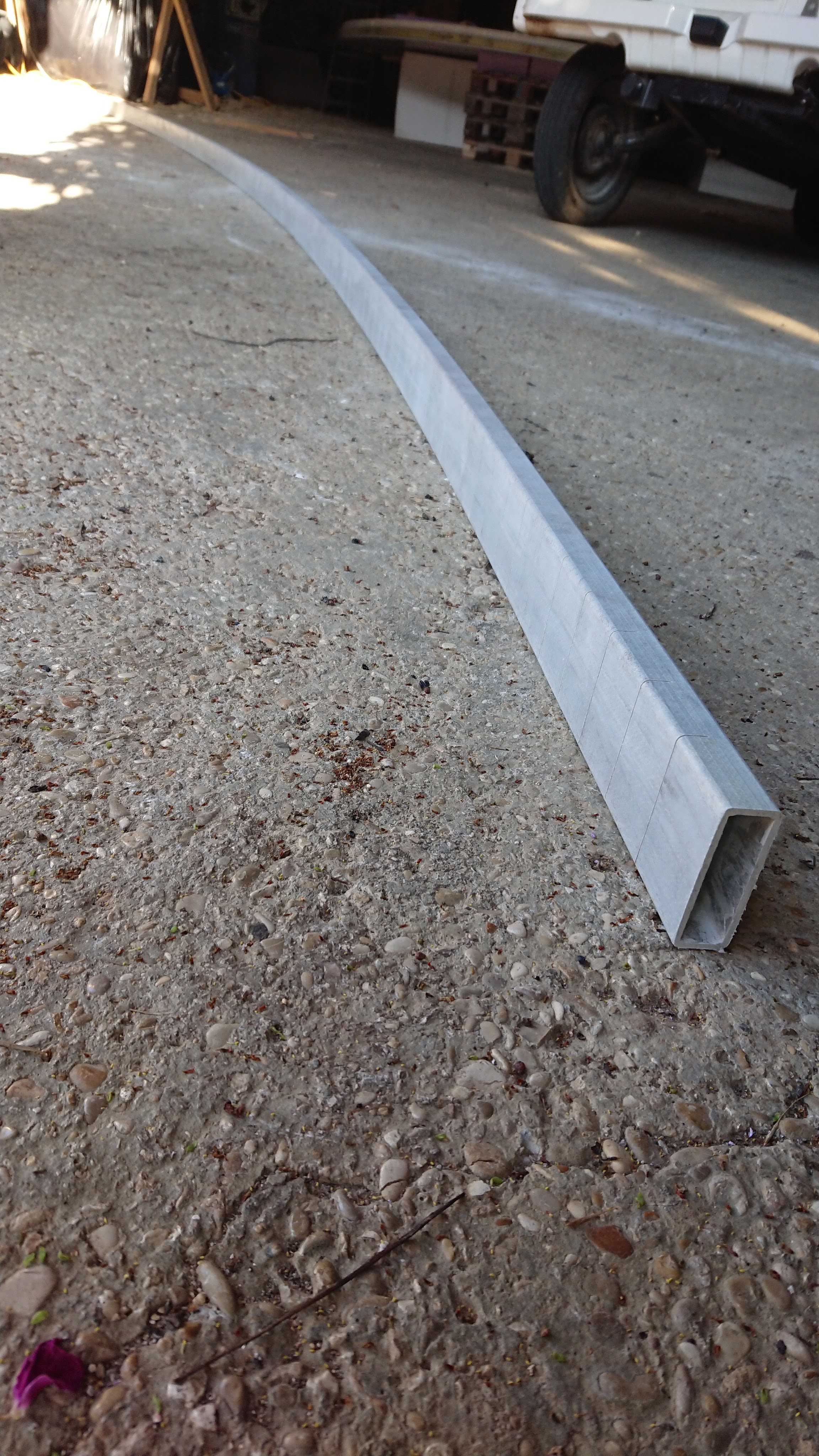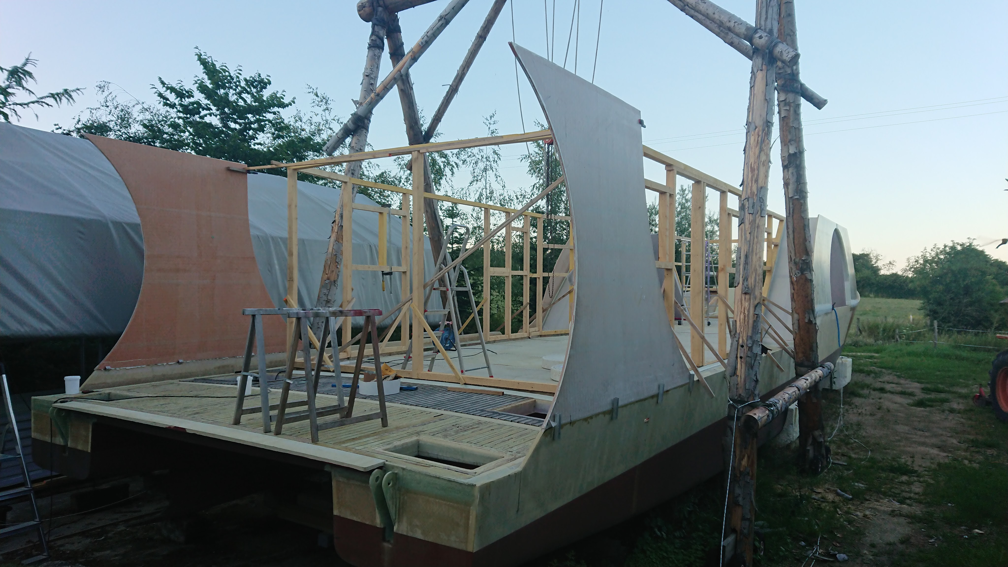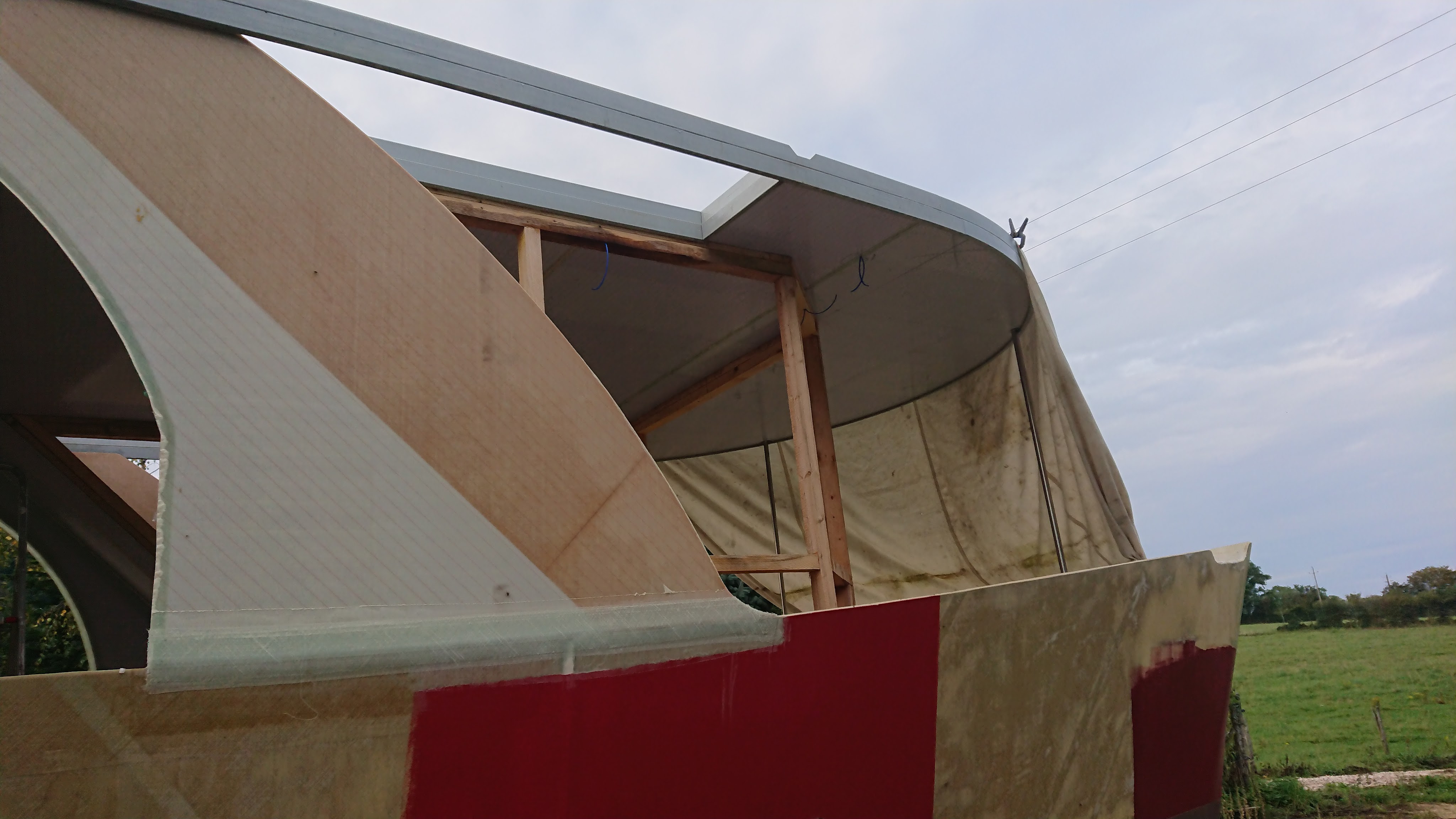 Il reste les deux montants arrière en sandwich époxy à monter, ils supporteront le toit, fermeront un peu l’arrière et casseront, on l’espère, le côté cube de l’habitation.