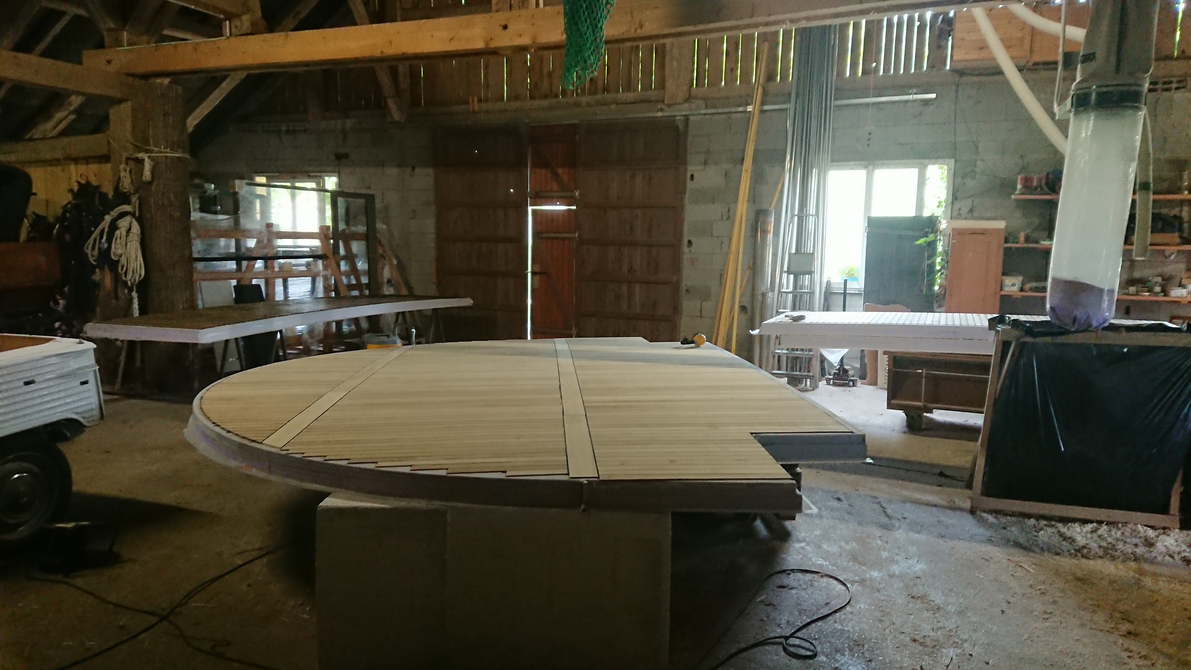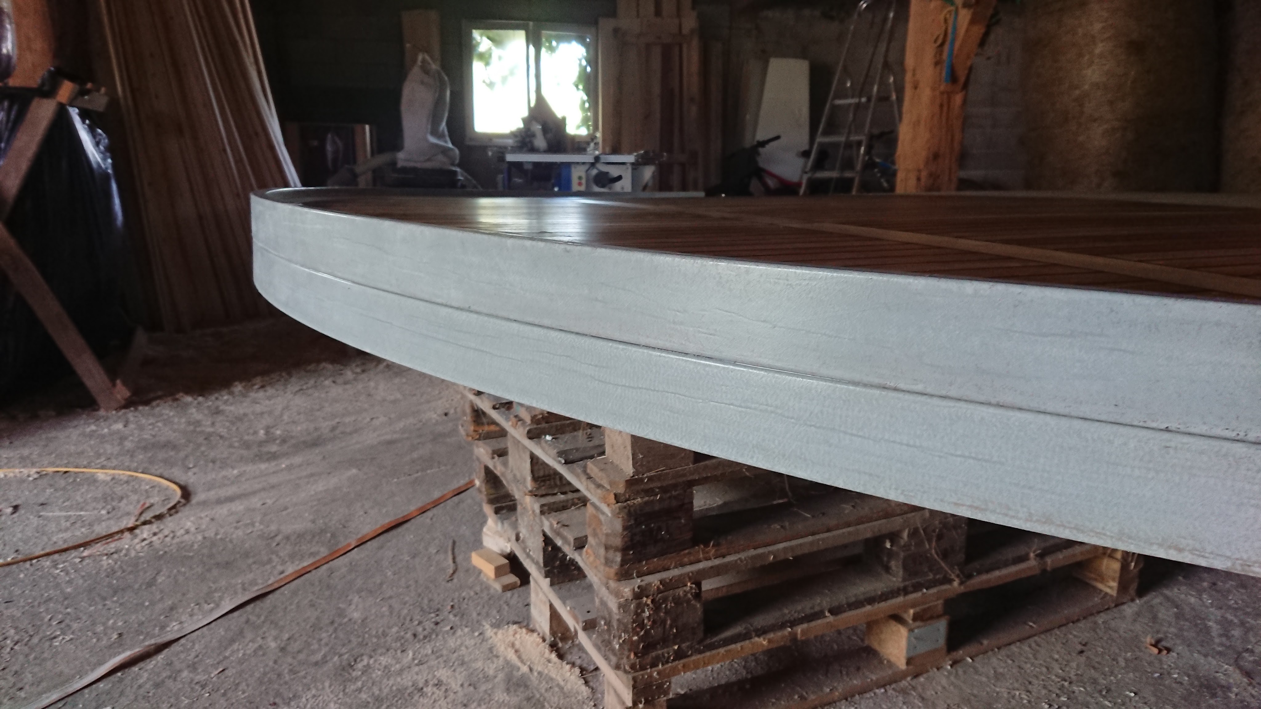 La pièce avant, de par sa forme arrondie et sa hauteur une fois montée sur le bateau, est complètement terminée en atelier.