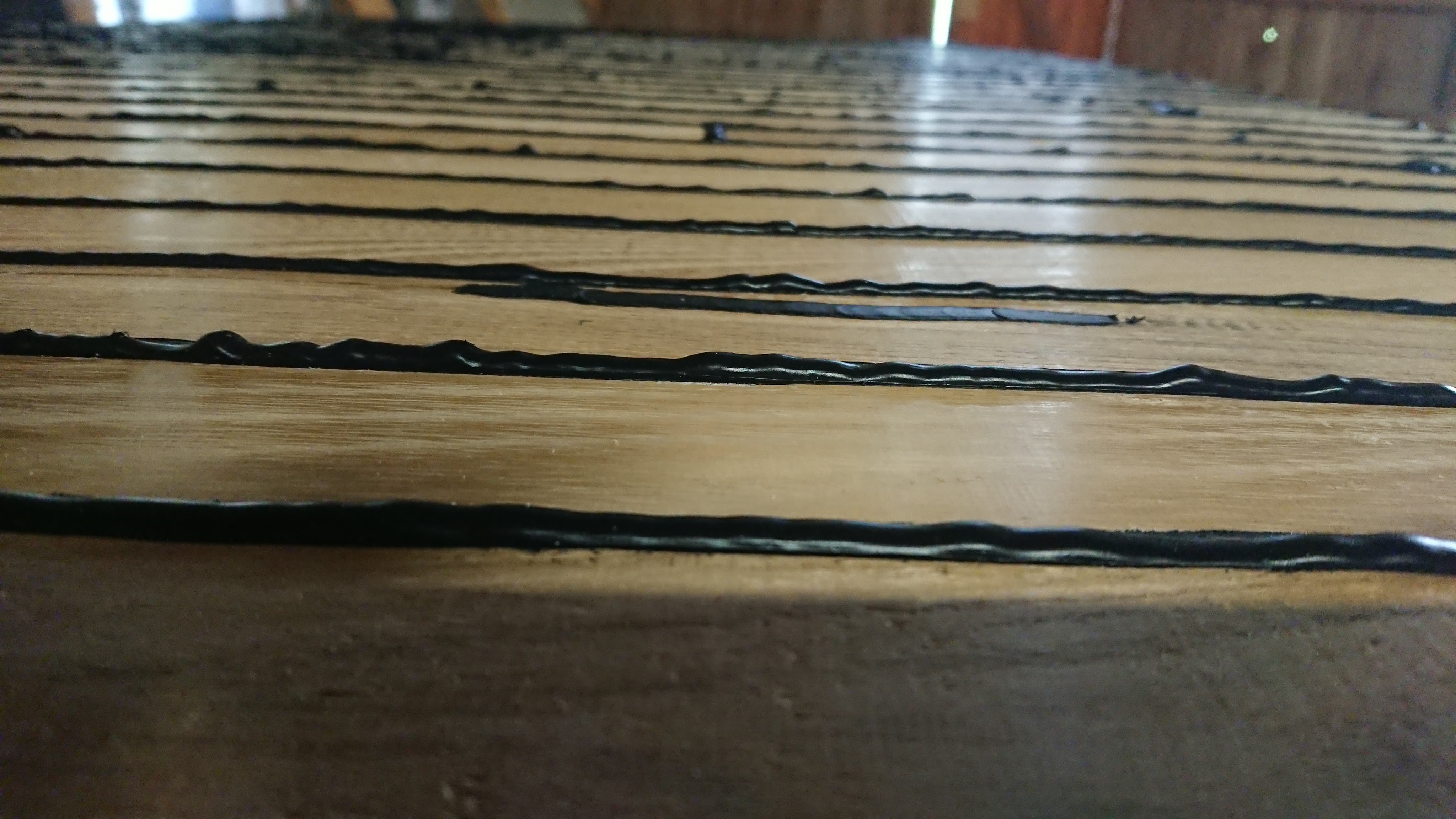 La pose du polyuréthane noir dans les joints, si possible sans faire de bulles, et le ponçage.