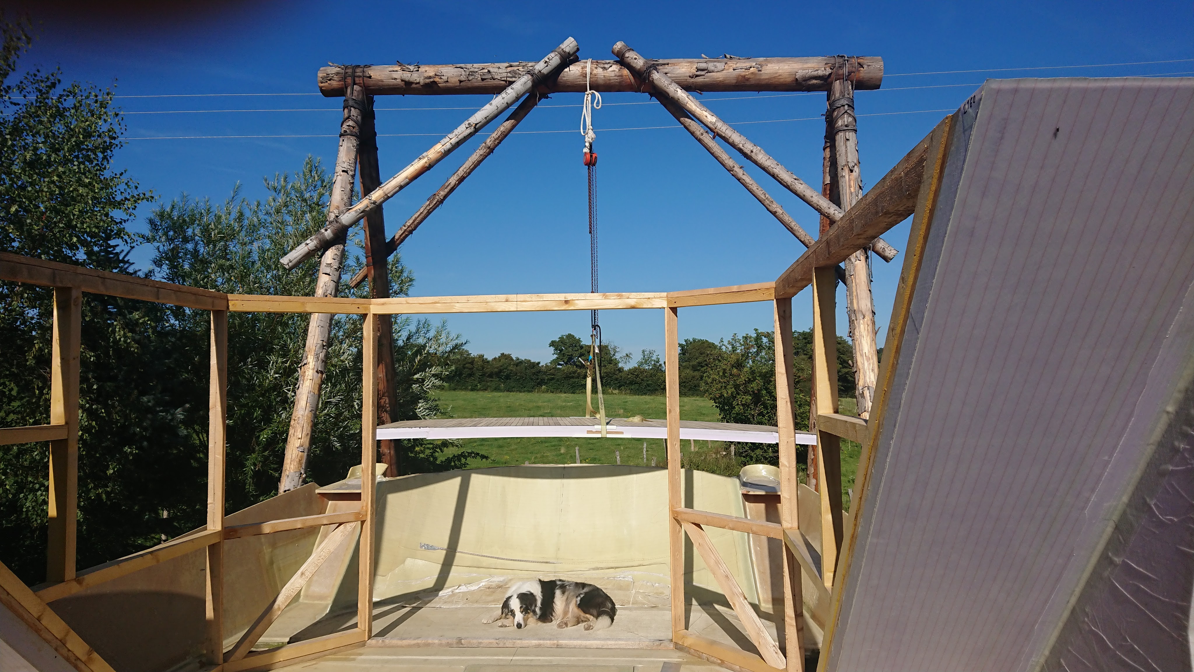 La charpente est composée de poutrelles en sapin de 80 x 60 mm, les sablières sont collées et vissées sur les lisses en chêne, les montants eux, sont collés, vissés et tenonnés.