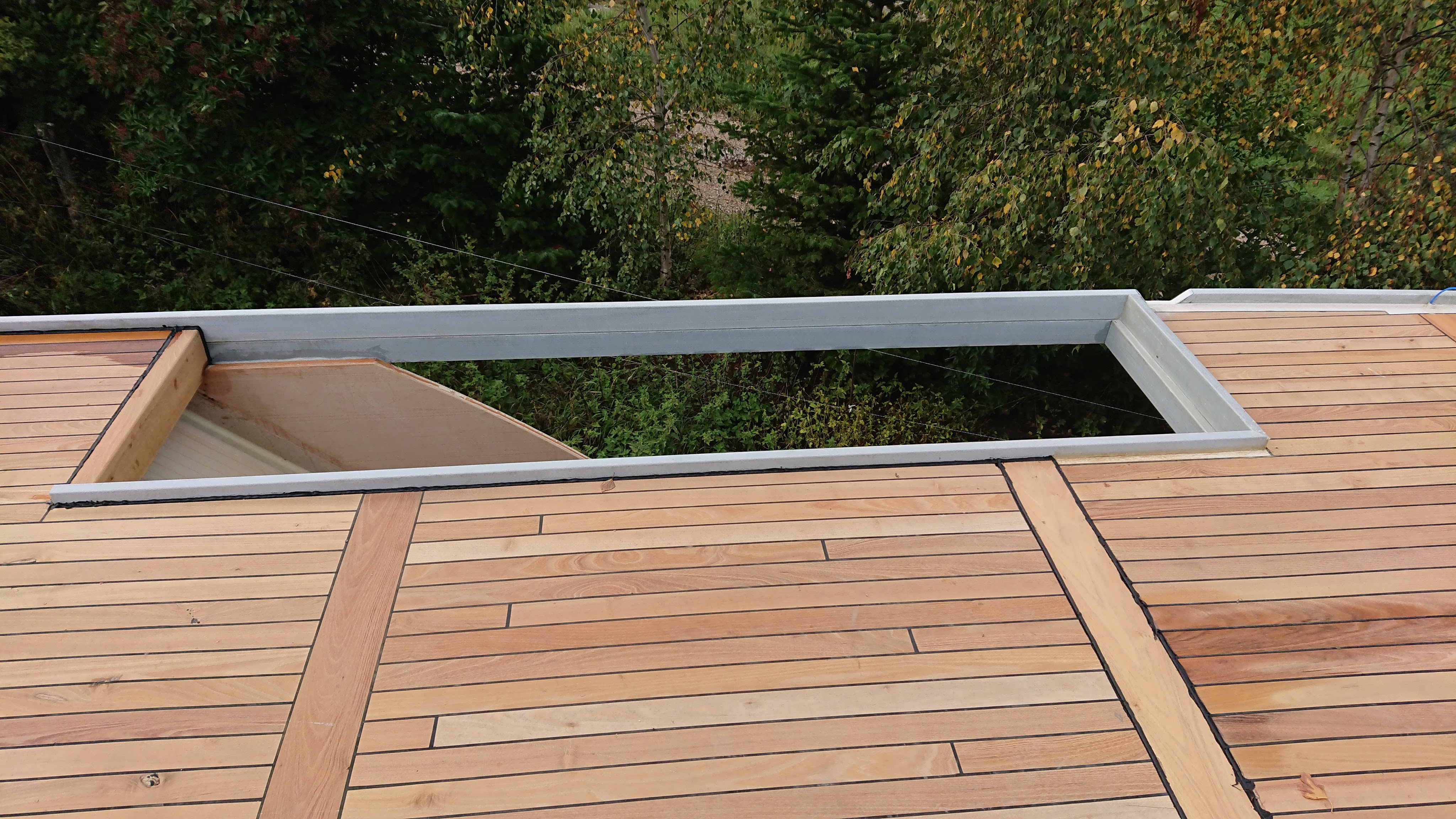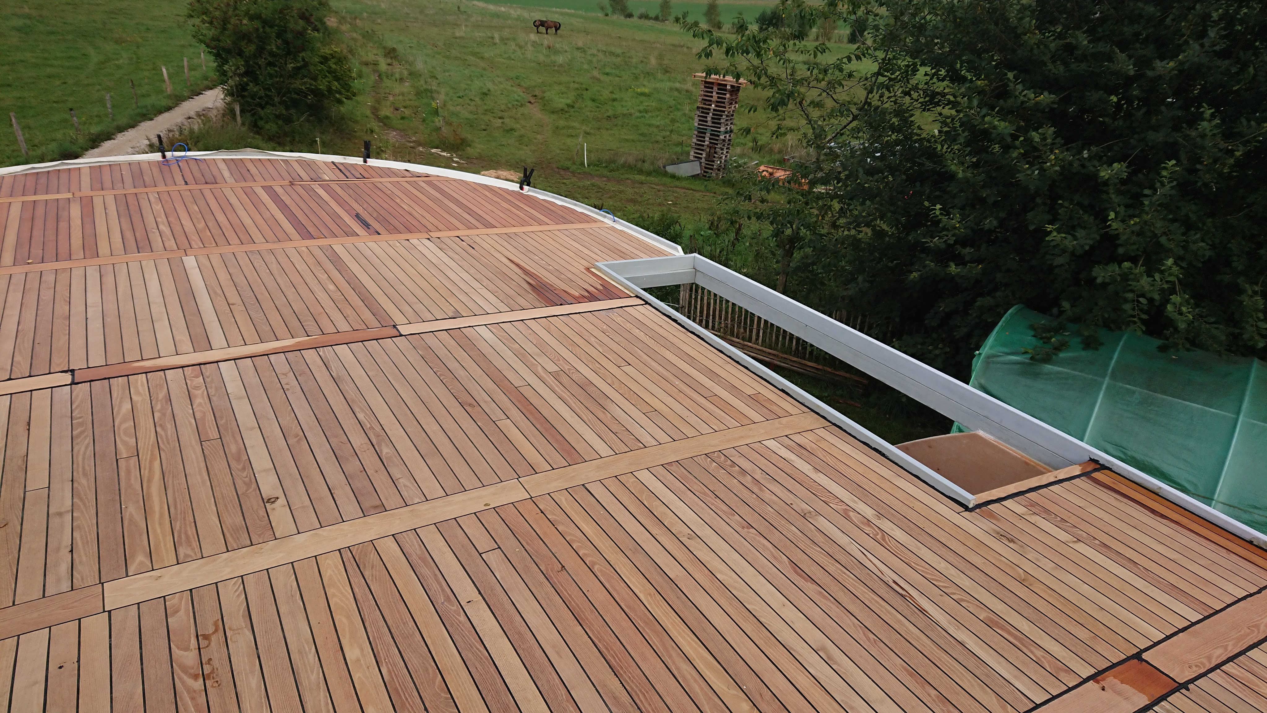 La partie avant sera la terrasse et la partie arrière recevra les capteurs solaires. Nous finissons la terrasse en collant des lames d’acacia entre les éléments.