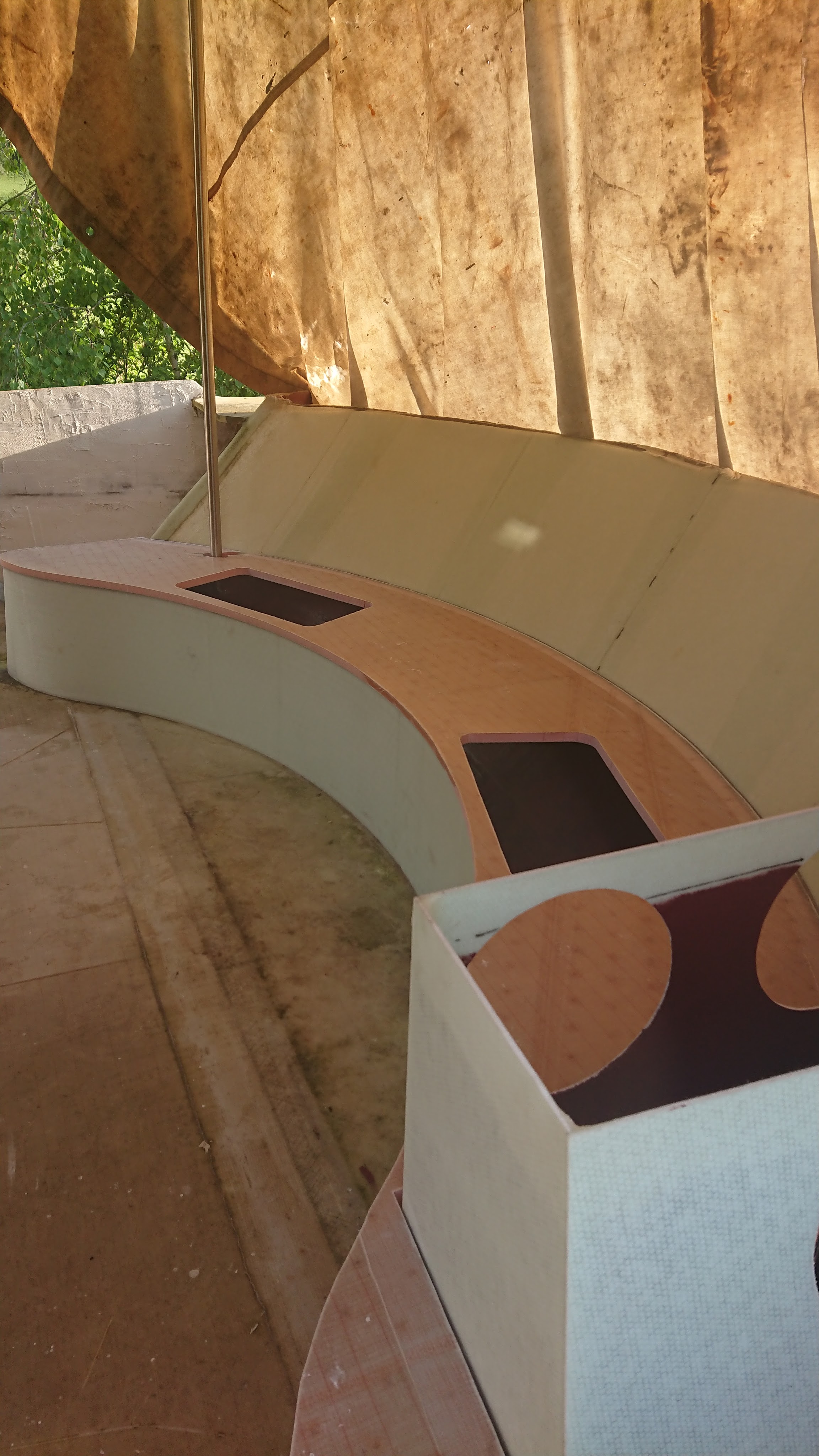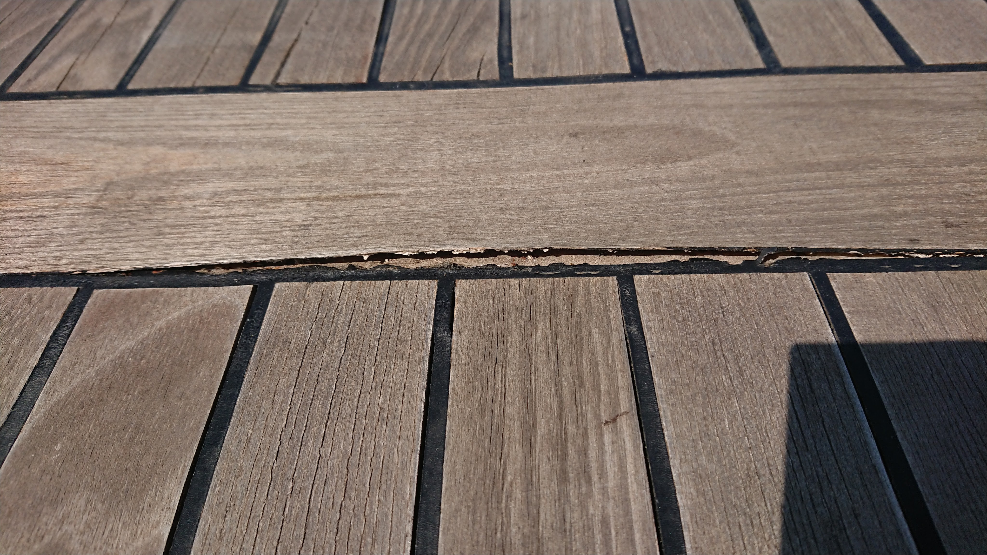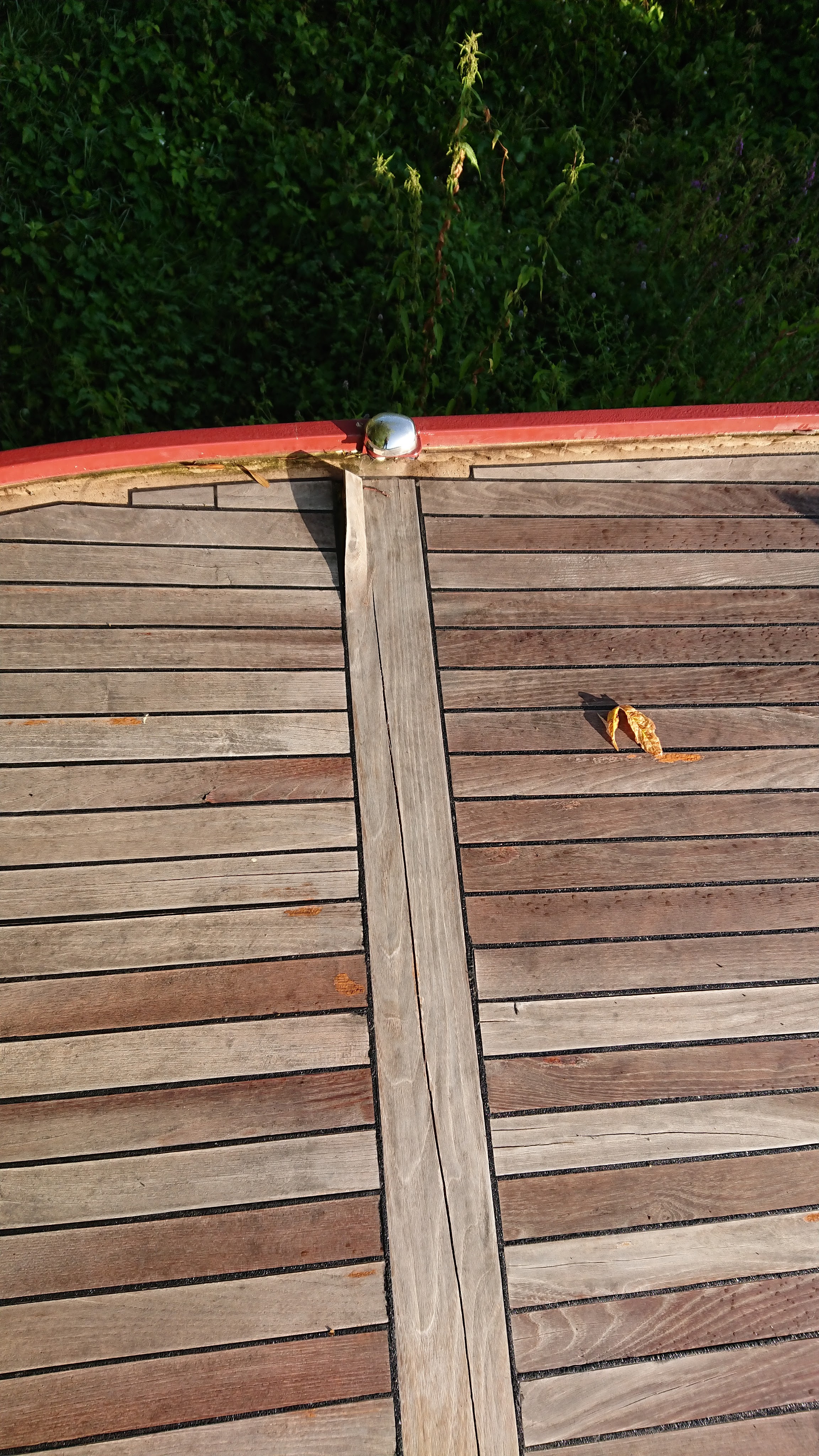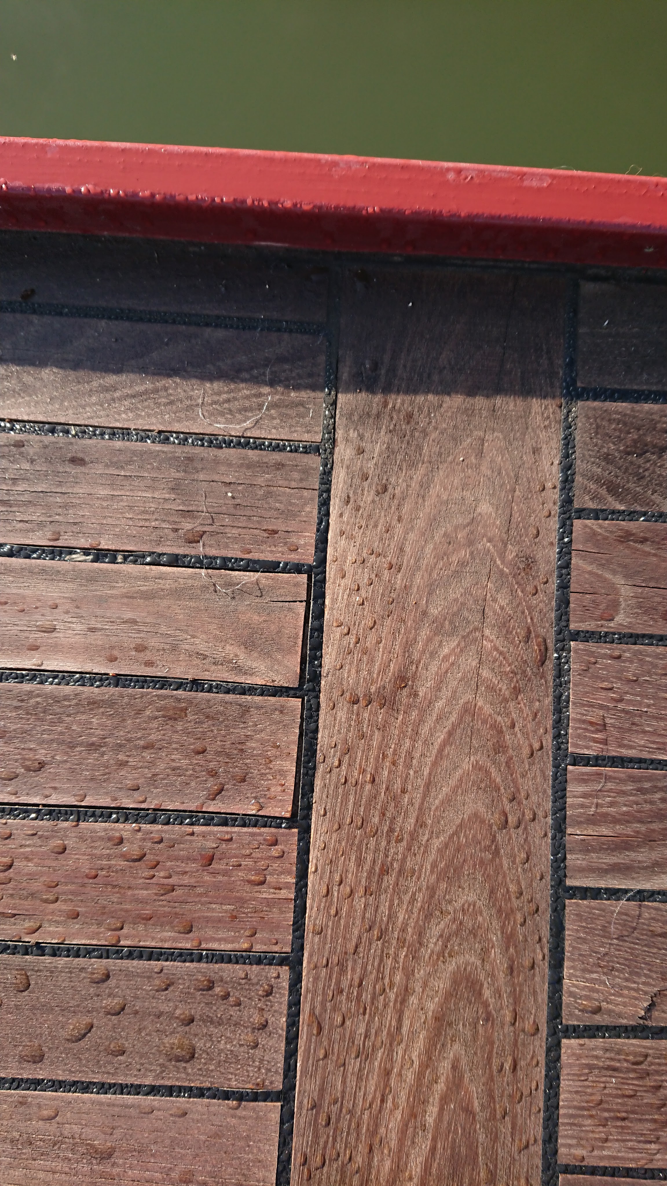 Pose du revêtement de pont en acacia… qui se décolle au bout d’une semaine. Les ponts en acacia sont un échec cuisant. Enormément de travail, ça a couté un bras, pour un résultat nul. Nous arrachons directement les lames pour les remplacées par du liège. C’est peut être moins joli mais ça se travaille facilement, c’est beaucoup moins cher, ça ne chauffe pas au soleil, c’est isolant, imputrescible et c’est agréable à pieds nus. A voir en vieillissant…
