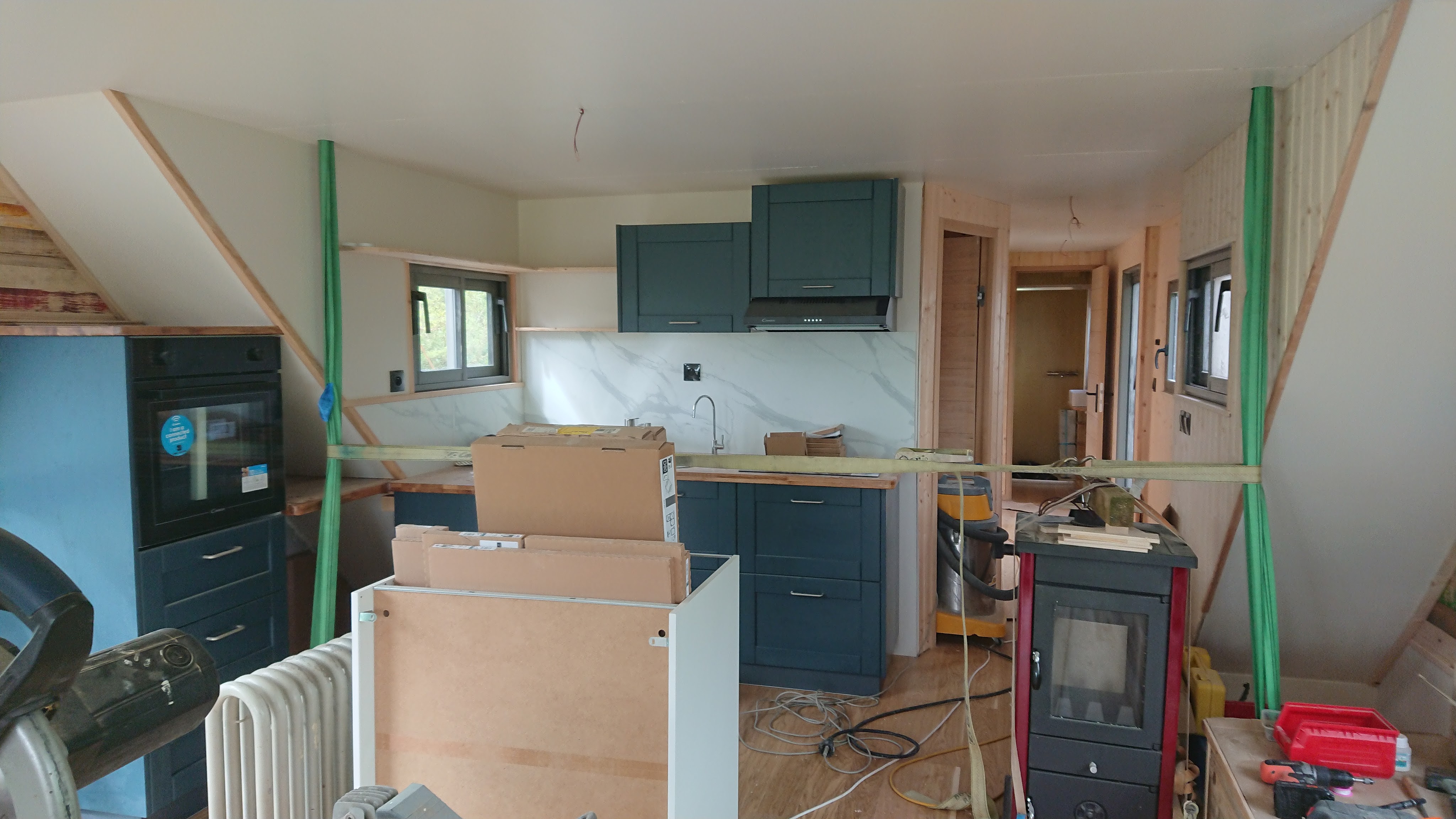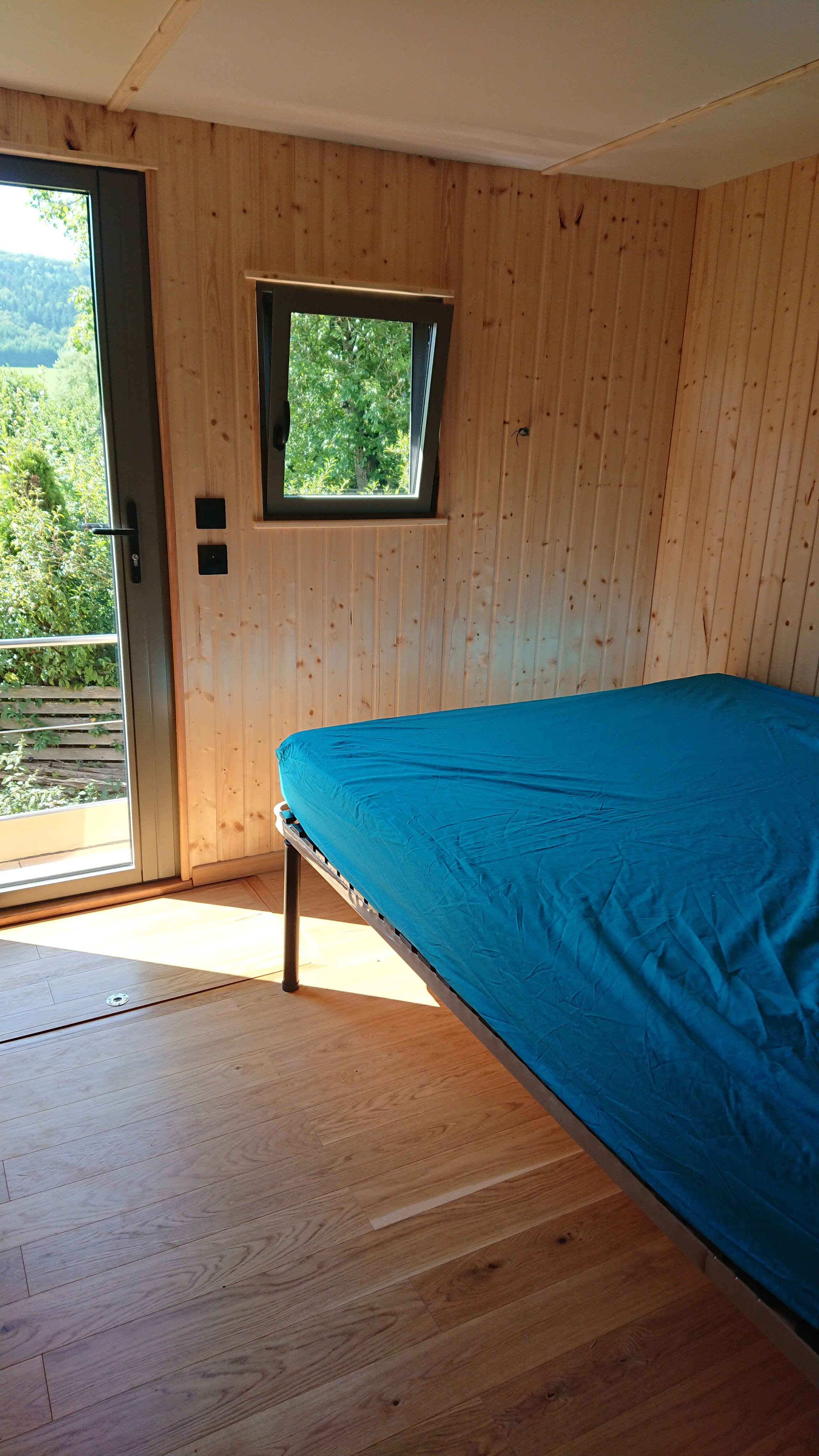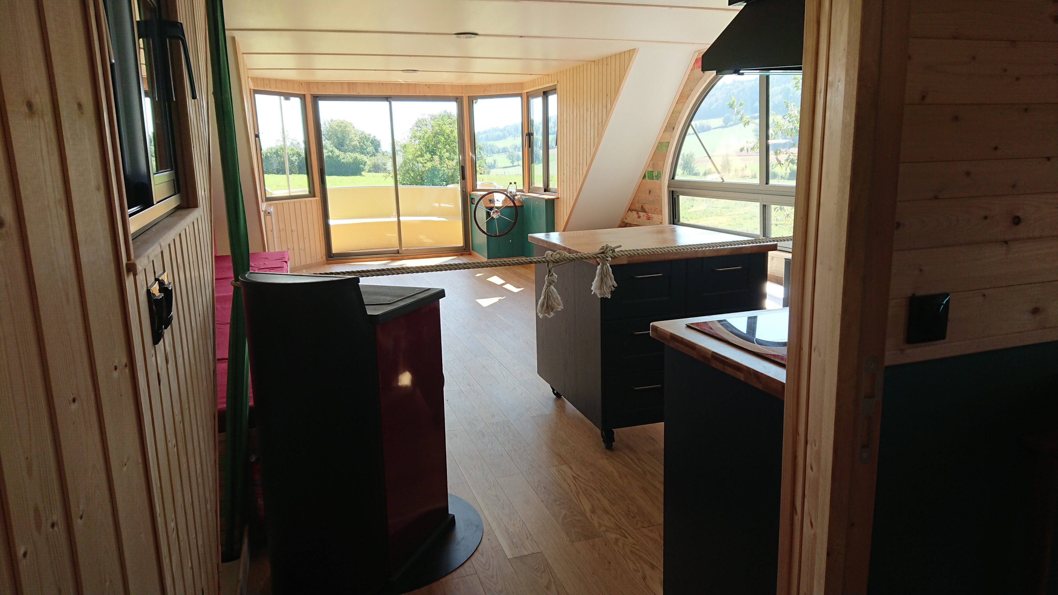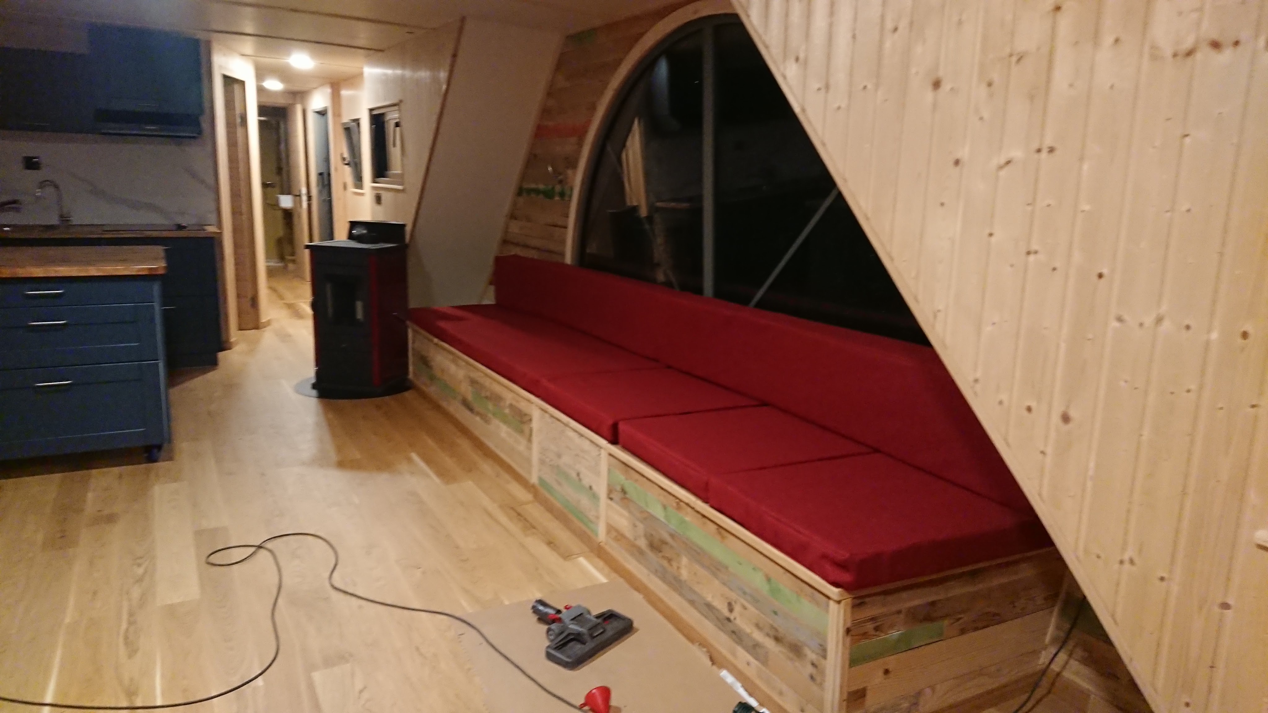 L’intérieur est terminé. Il reste quelques bricoles à finir et à tuber le petit poêle. Il chauffe l’eau sanitaire, les radiateurs et il est possible de mijoter un petit plat sur le dessus. Les lits sont provisoirement montés sur pieds mais seront par la suite suspendus et rangés au plafond la journée pour laisser la place à des meubles bas de type commode et bureau, par exemple.