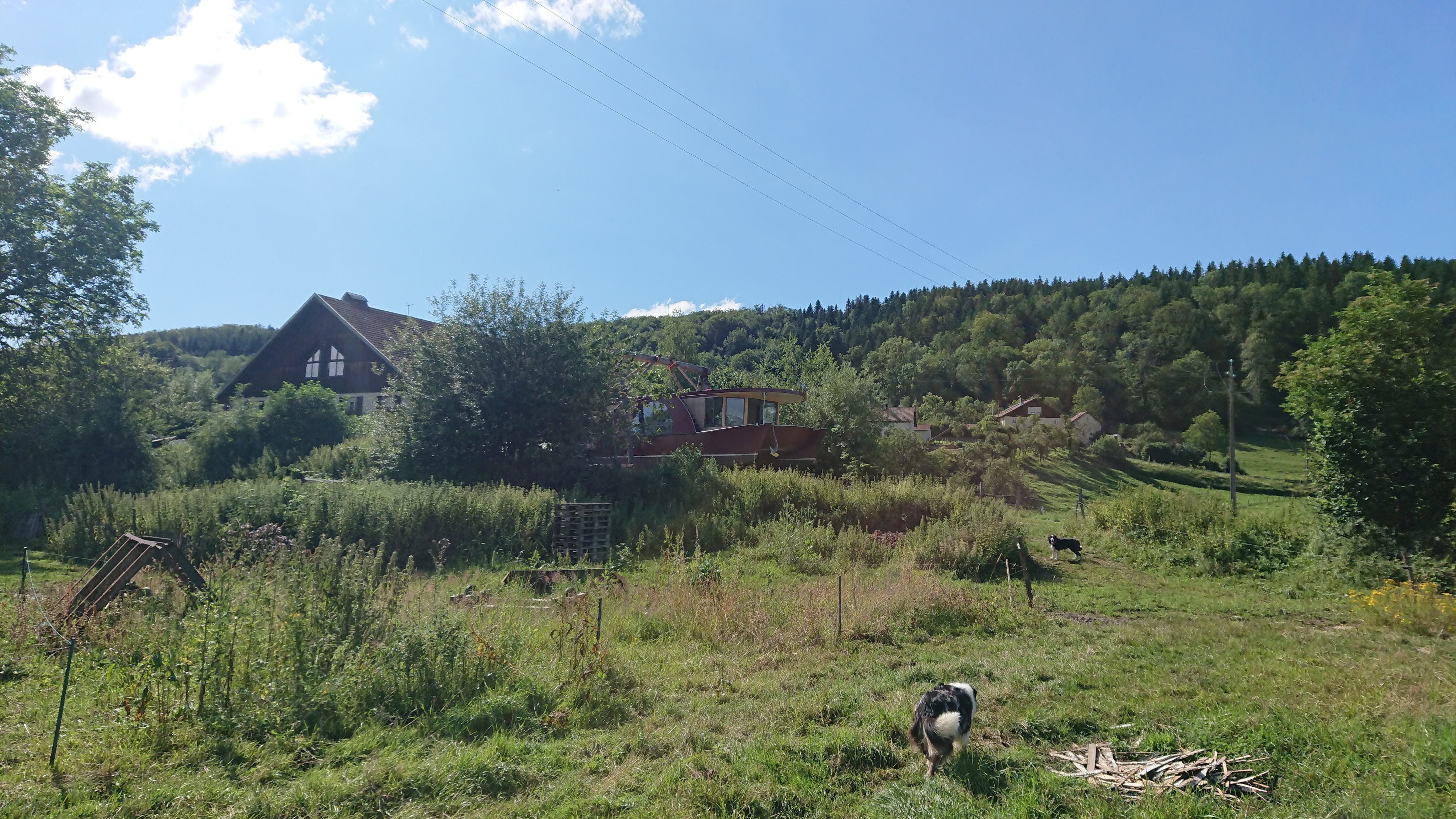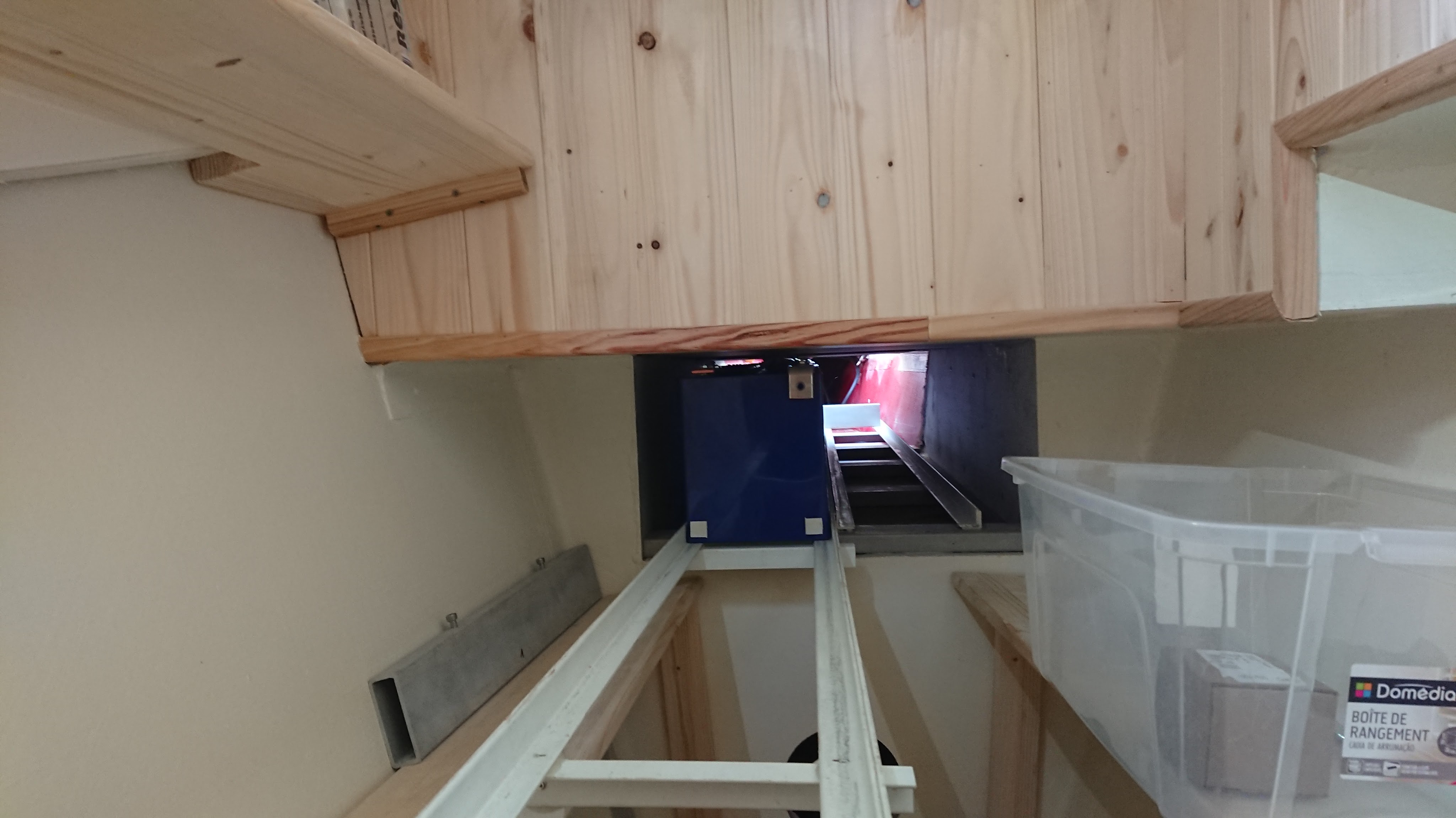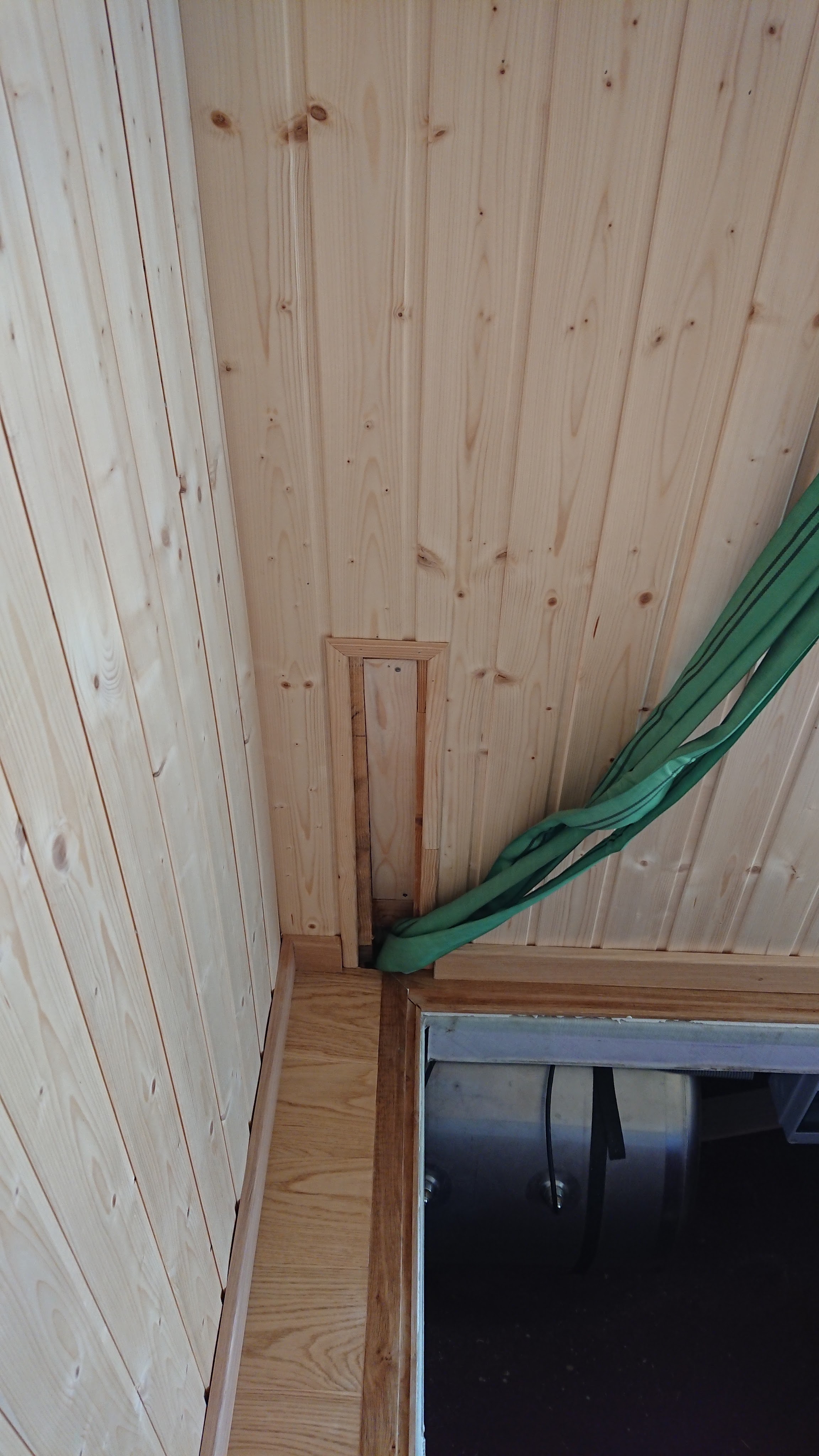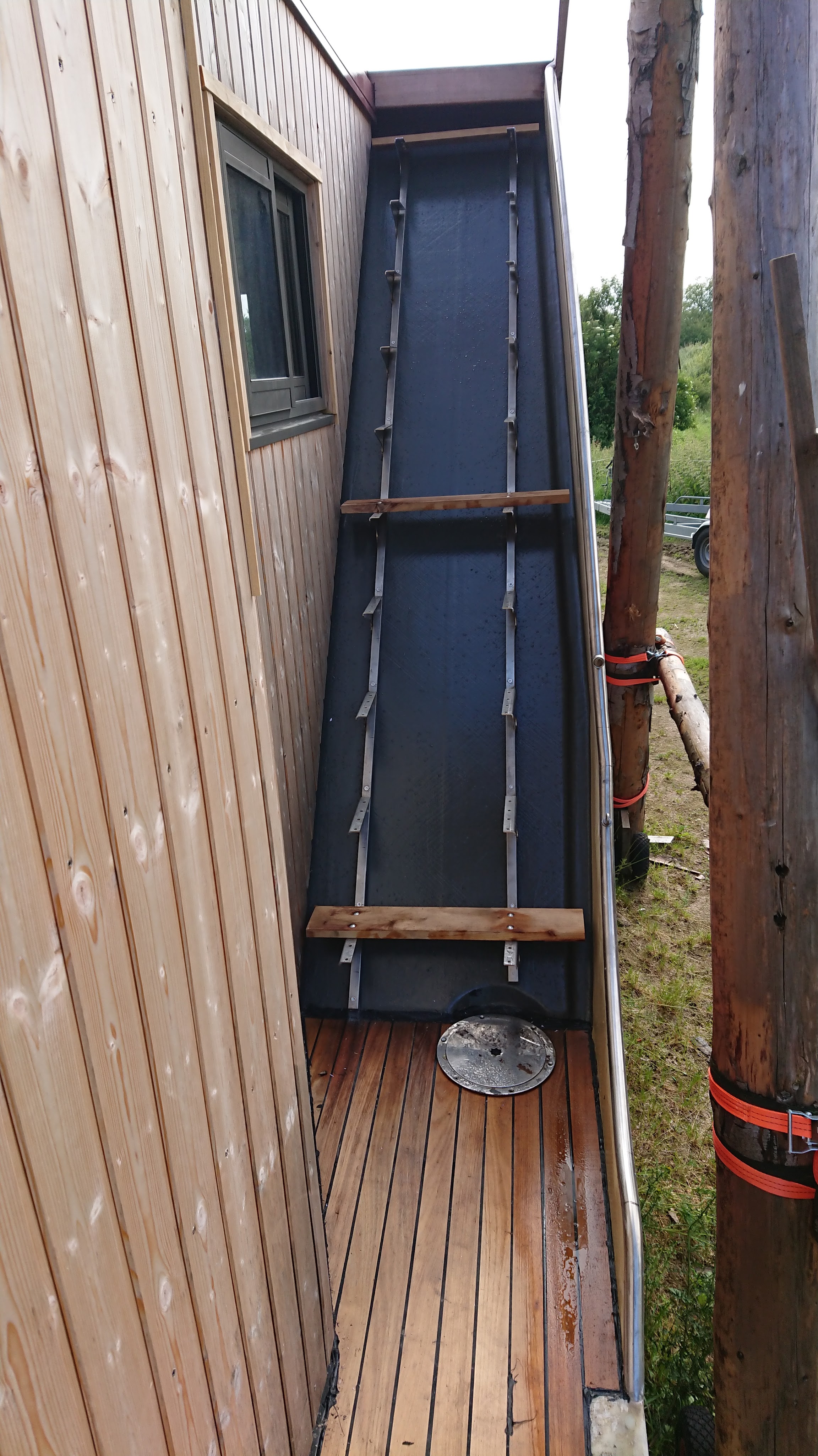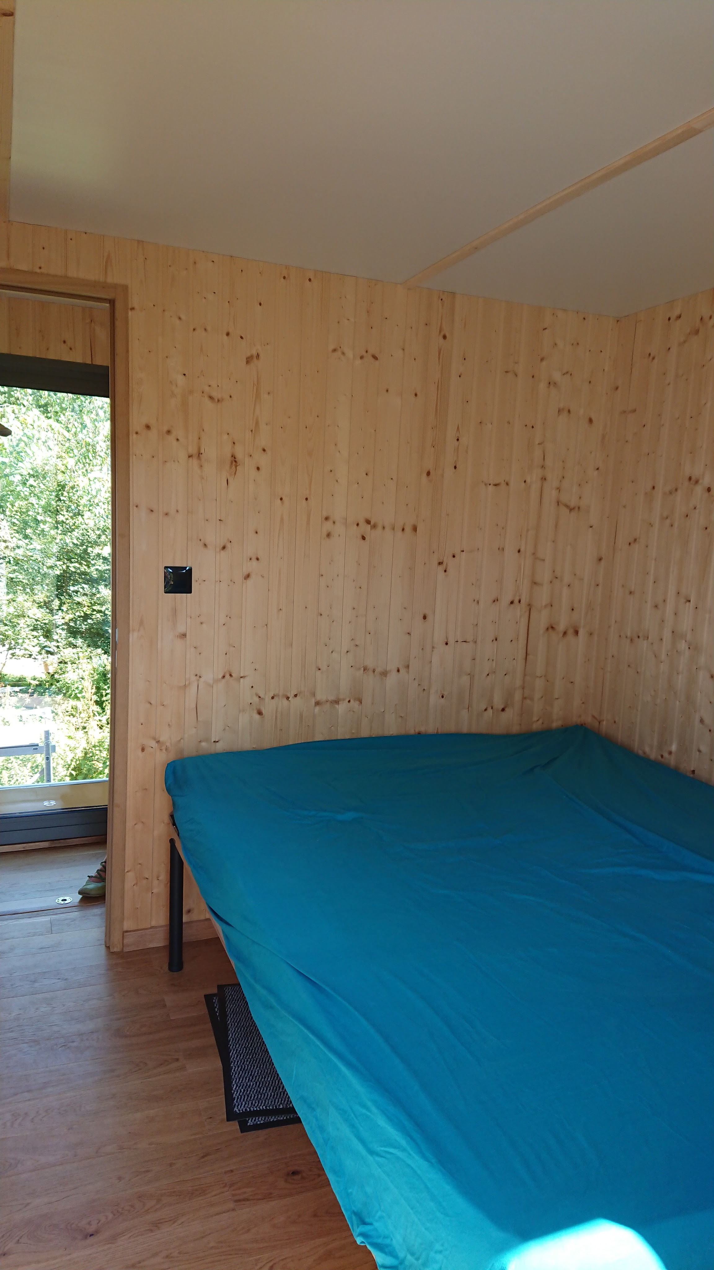 L’intérieur est terminé. Il reste quelques bricoles à finir et à tuber le petit poêle. Il chauffe l’eau sanitaire, les radiateurs et il est possible de mijoter un petit plat sur le dessus. Les lits sont provisoirement montés sur pieds mais seront par la suite suspendus et rangés au plafond la journée pour laisser la place à des meubles bas de type commode et bureau, par exemple.