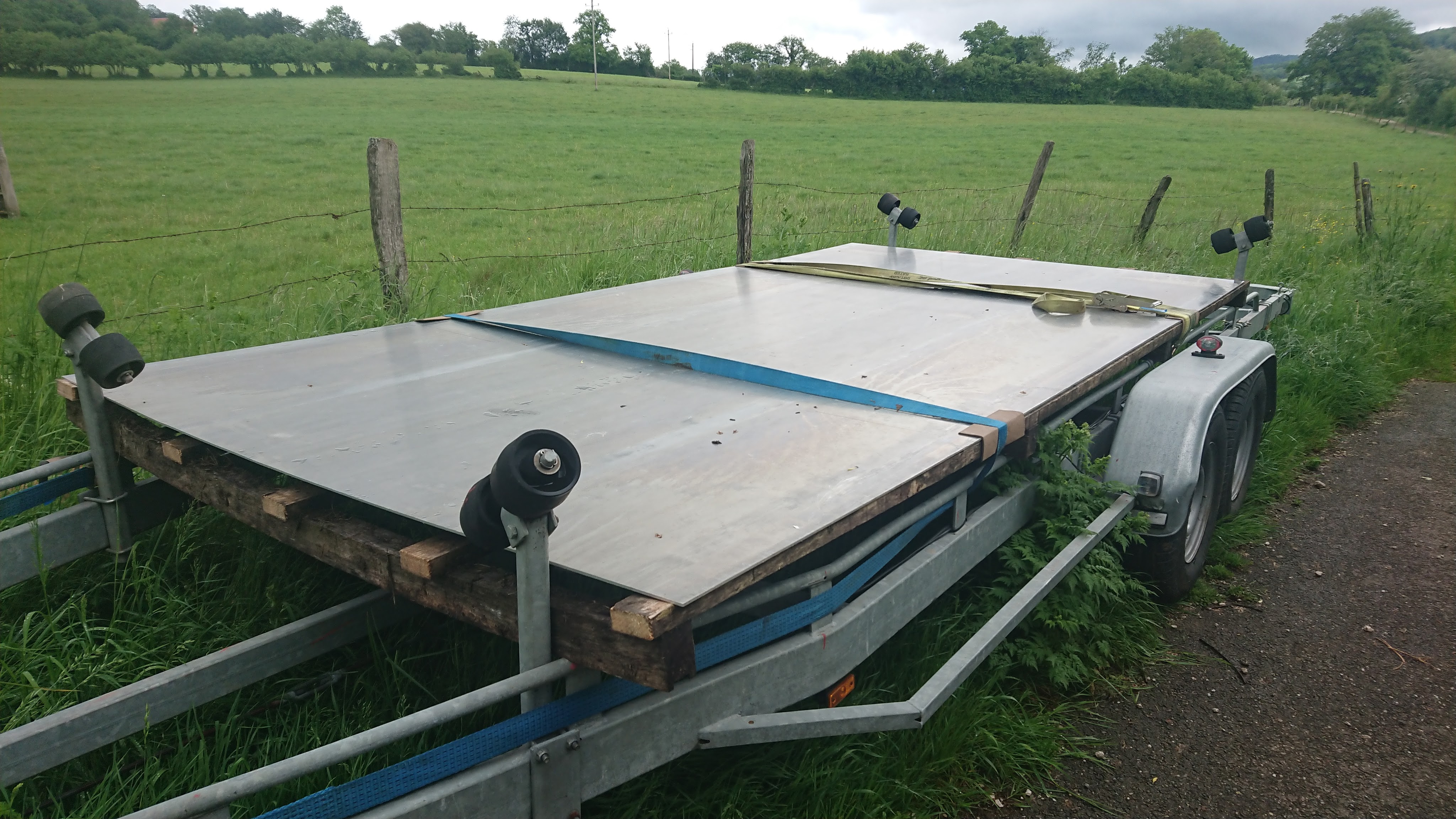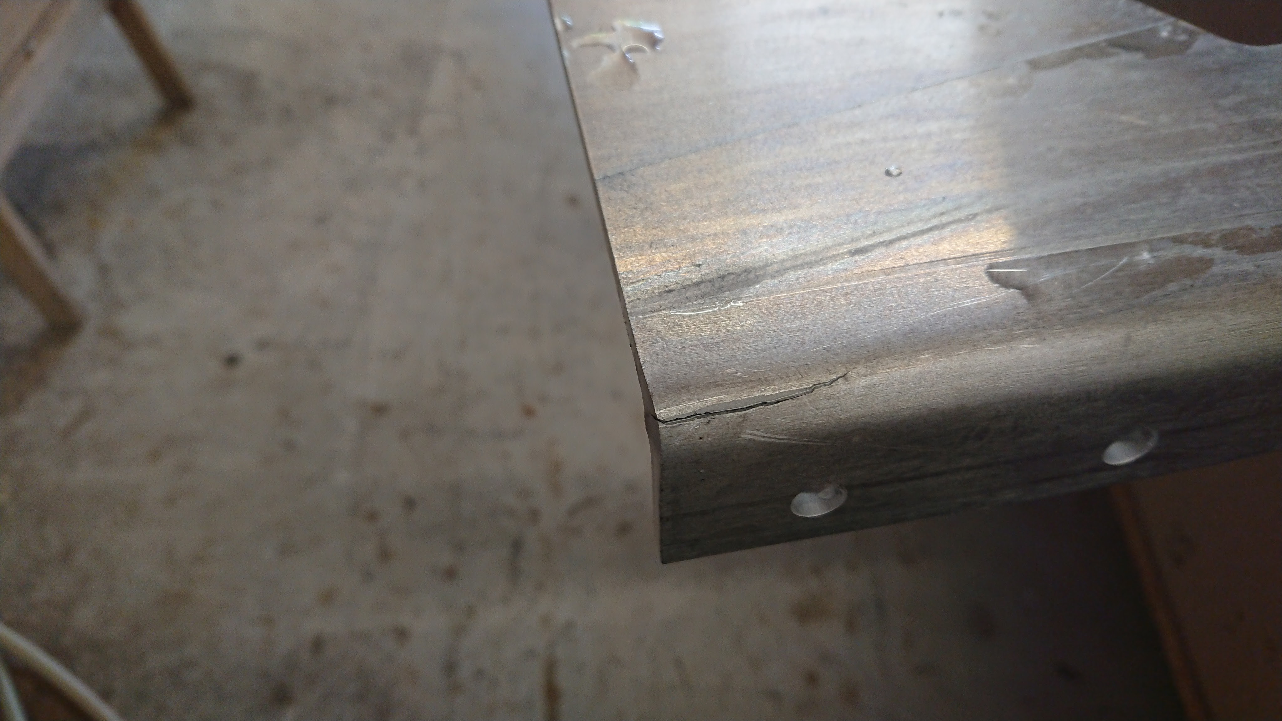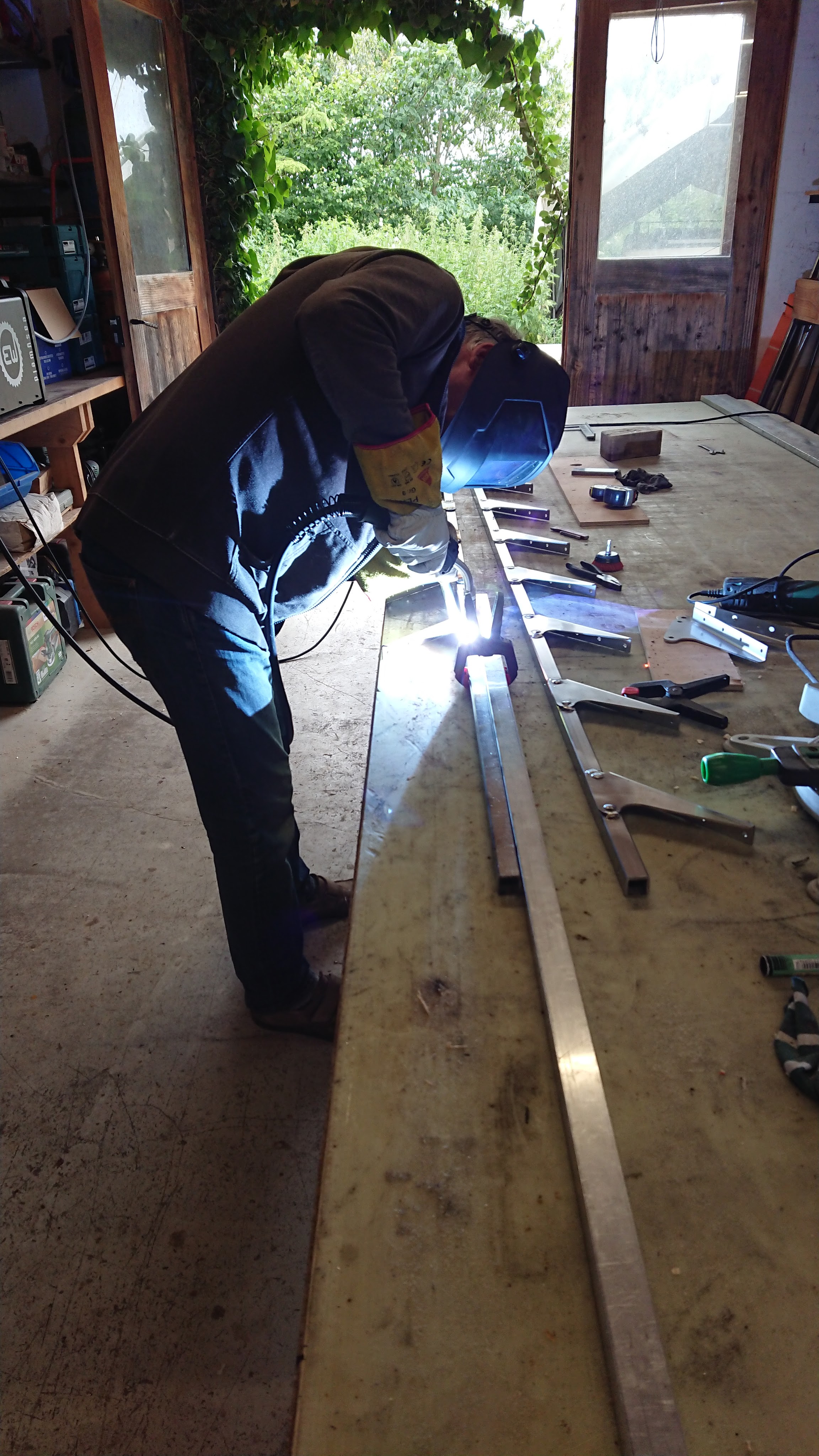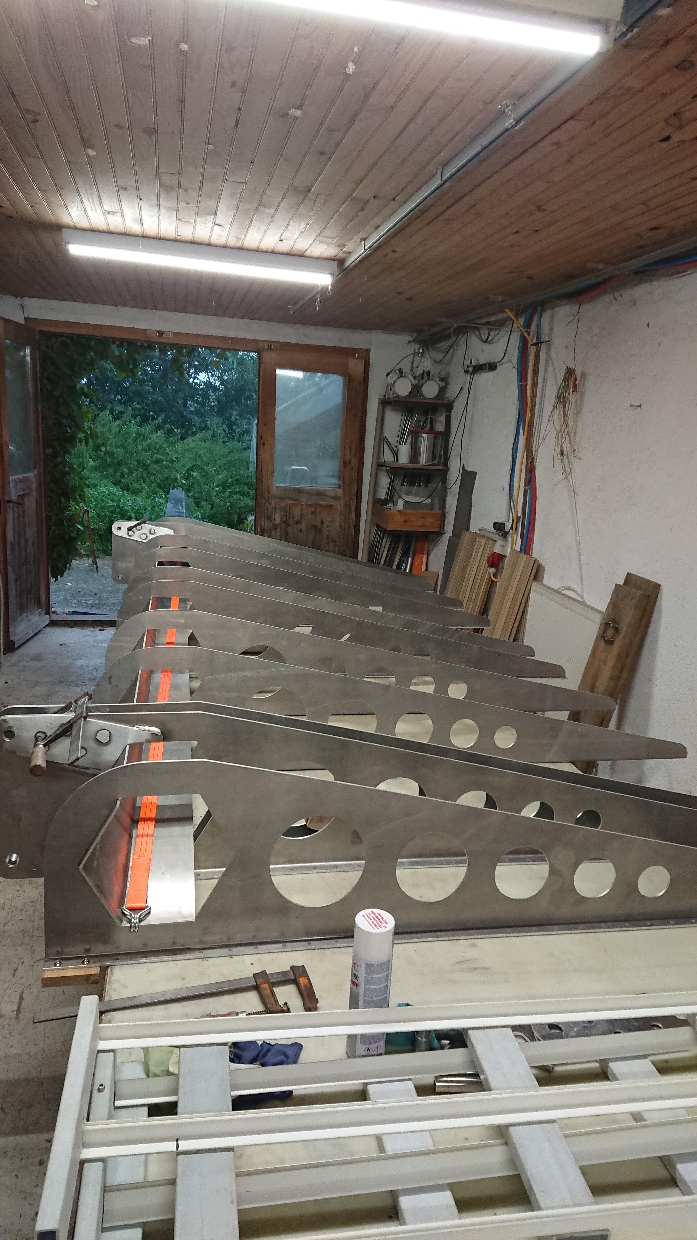 La tôle en aluminium qui nous a servi de table est envoyée à la découpe. Elle revient sous forme de pièces qui vont être assemblées pour devenir la plage arrière. Le résultat est médiocre; les découpes ne sont pas ébavurées. A chaque pli, il y a des fissures parce qu’ils ont fait les rayons trop serrés malgré des consignes et des dessins précis.