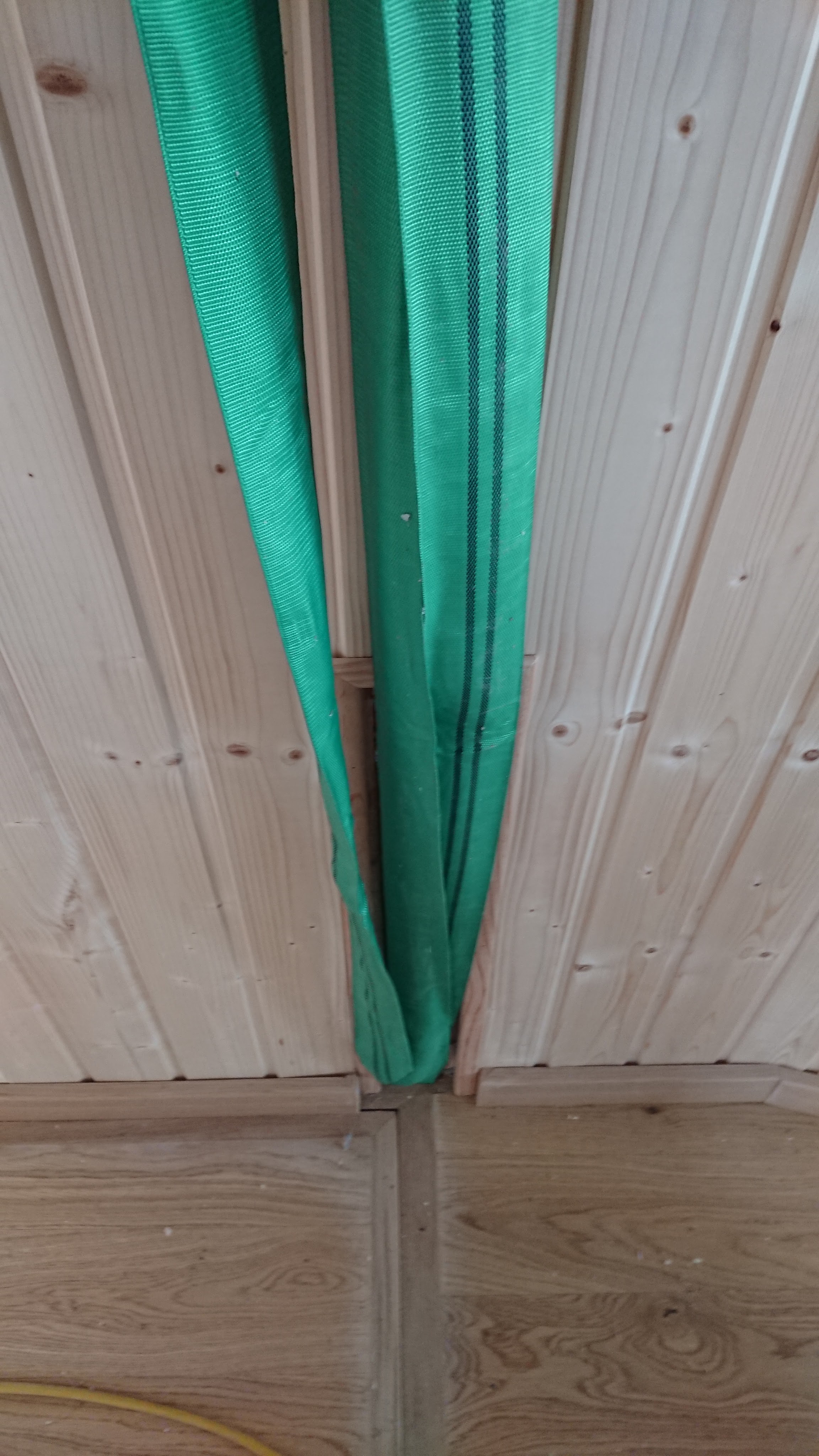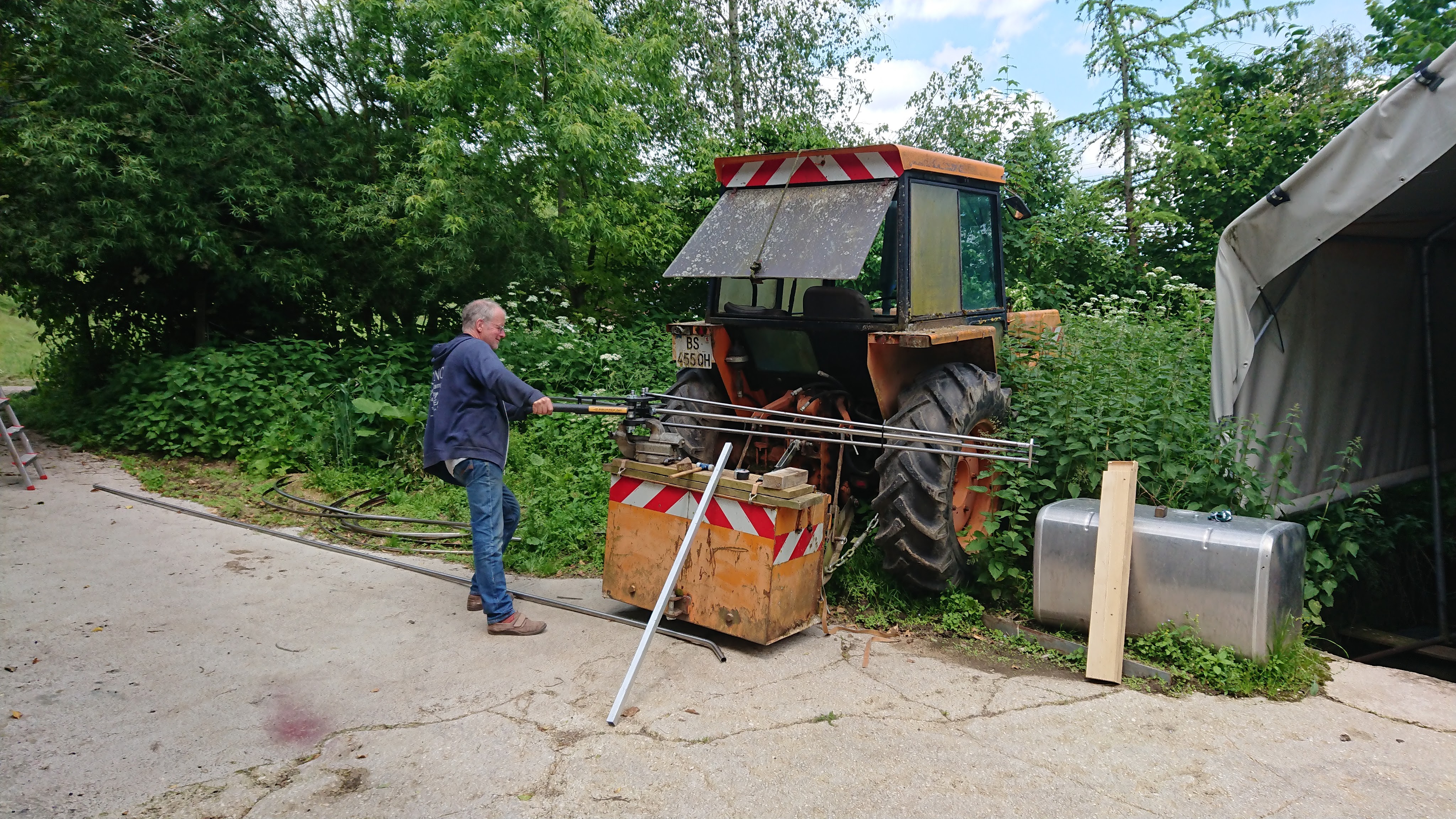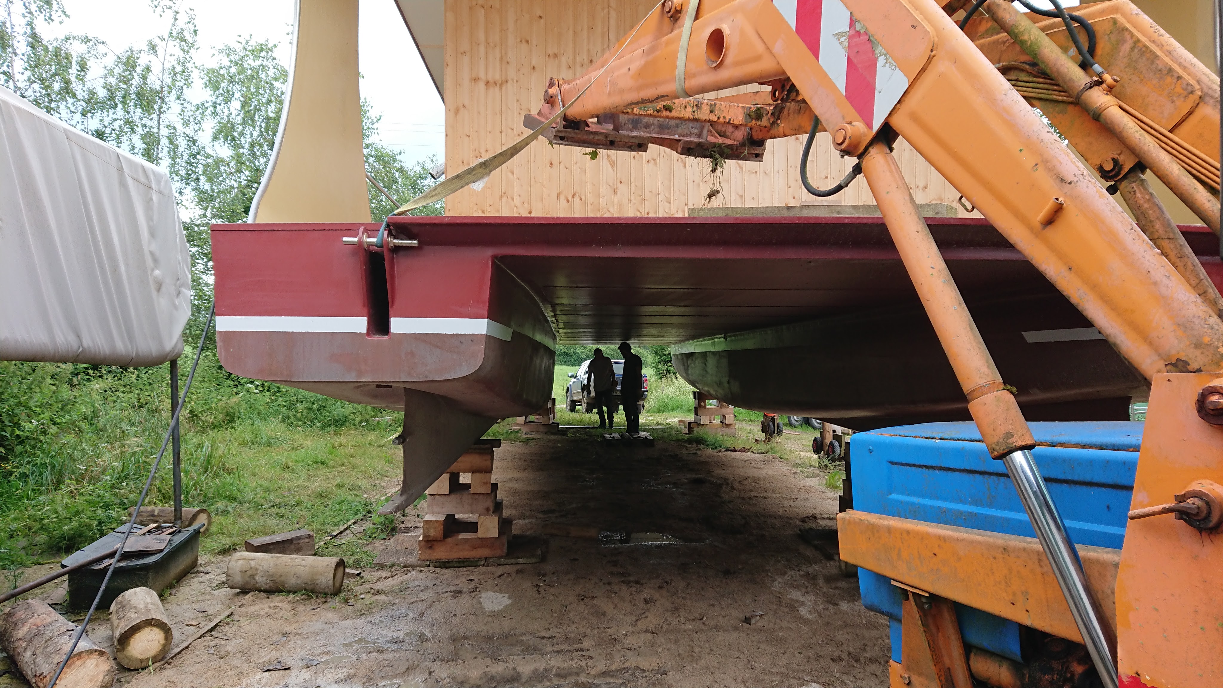 Les sangles de levages sont vraiment pratiques. Elles sont fixées à des poutrelles solidaires à la coque, traversent l’habitacle et sortent du toit d’une trentaine de cm. En revanche, nous ne pouvons pas lever aux 4 points d’encrages prévus puisque notre grue, elle, n’en a que deux. Nous levons le bateau uniquement à l’aide des sangles avant. A l’arrière, notre tracteur, qui ne lève que 800 kg, suffit tout juste à le stabiliser horizontalement. Il n’y a pas un seul craquement et le bateau est très rigide.