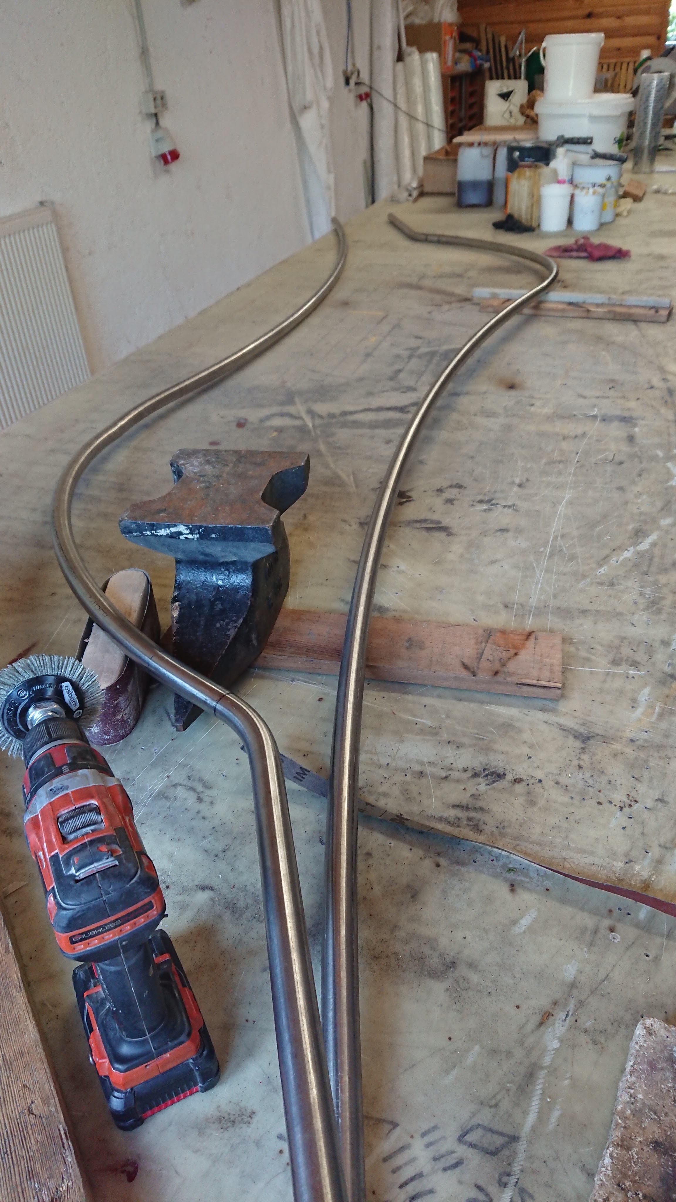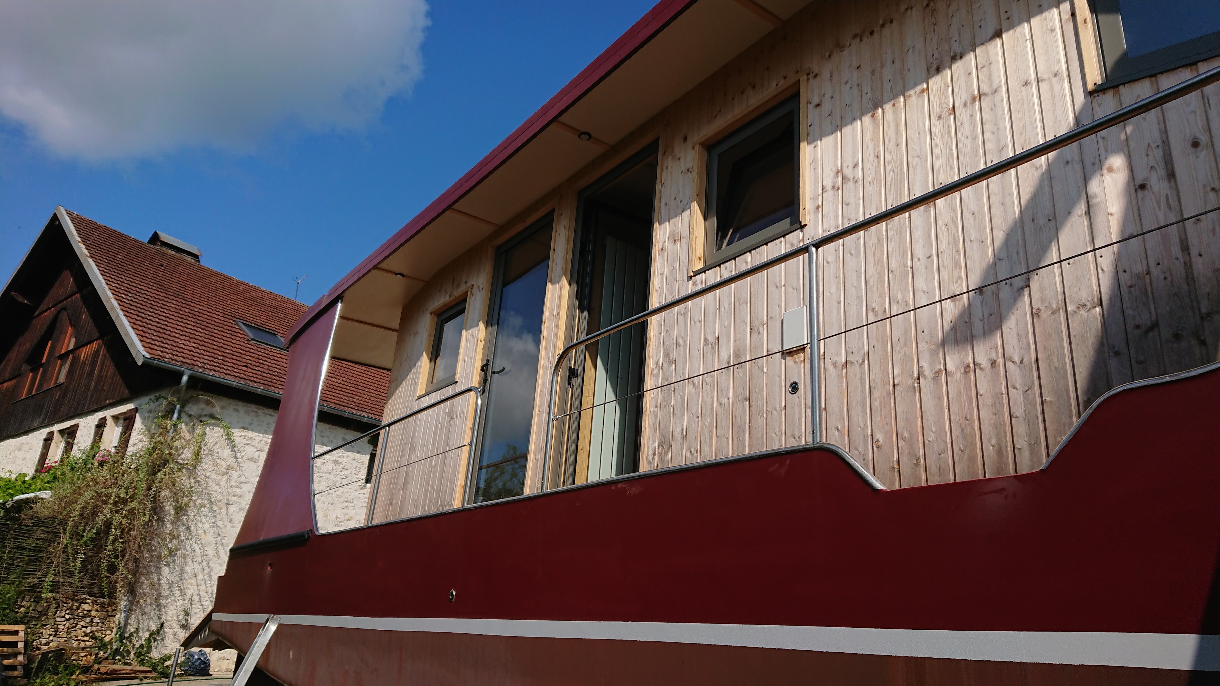 Pour la finition des bordées nous avons choisi des tubes ronds en acier inoxydable. Ils sont d’abord cintrés à la bonne forme, découpés sur toute la longueur et collés à cheval sur les bordées. C’est propre et solide. Les garde corps sont en tubes, eux aussi cintrés, et câbles en acier inoxydable. Les taquets sont collés et vissés. La ligne de flottaison (à peu près horizontale) donne un petit air de bateau fini.