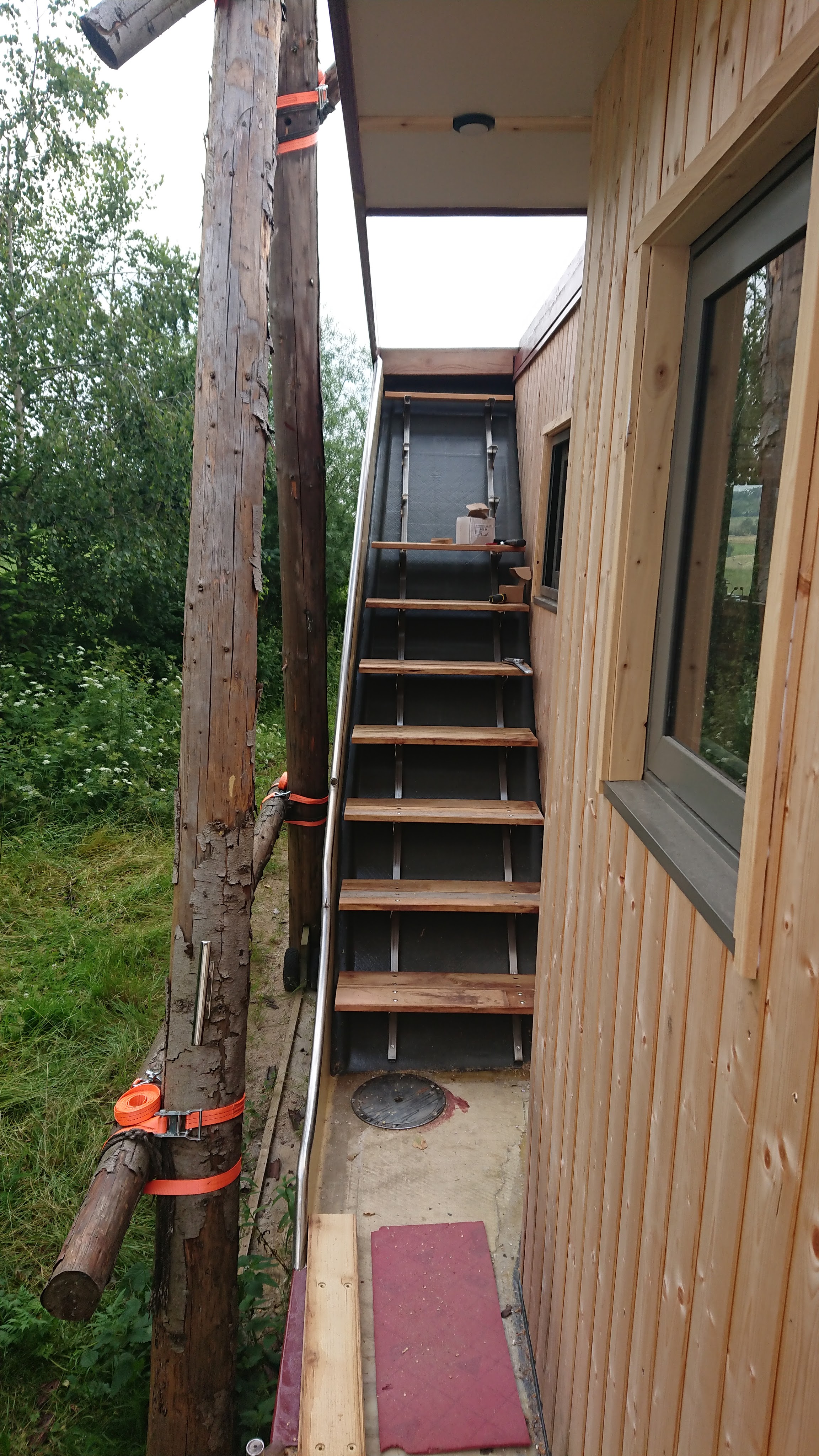 Fabrication et montage des escaliers extérieurs. Les limons sont en acier inoxydable et les marches en acacia.