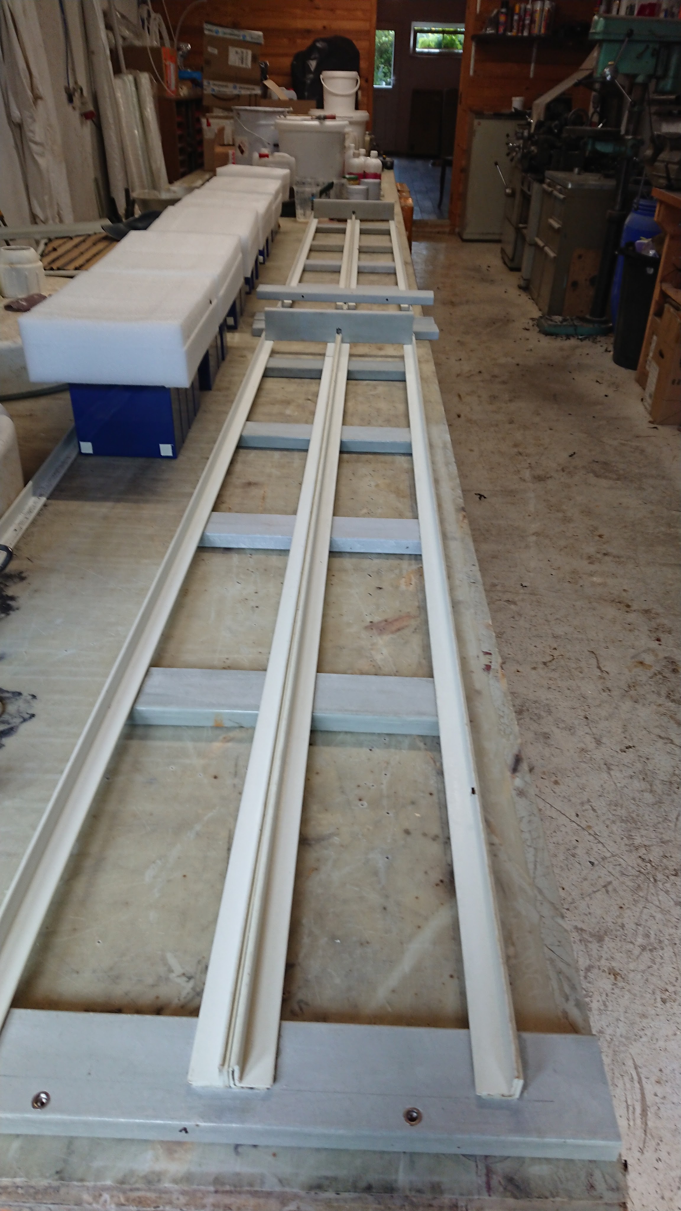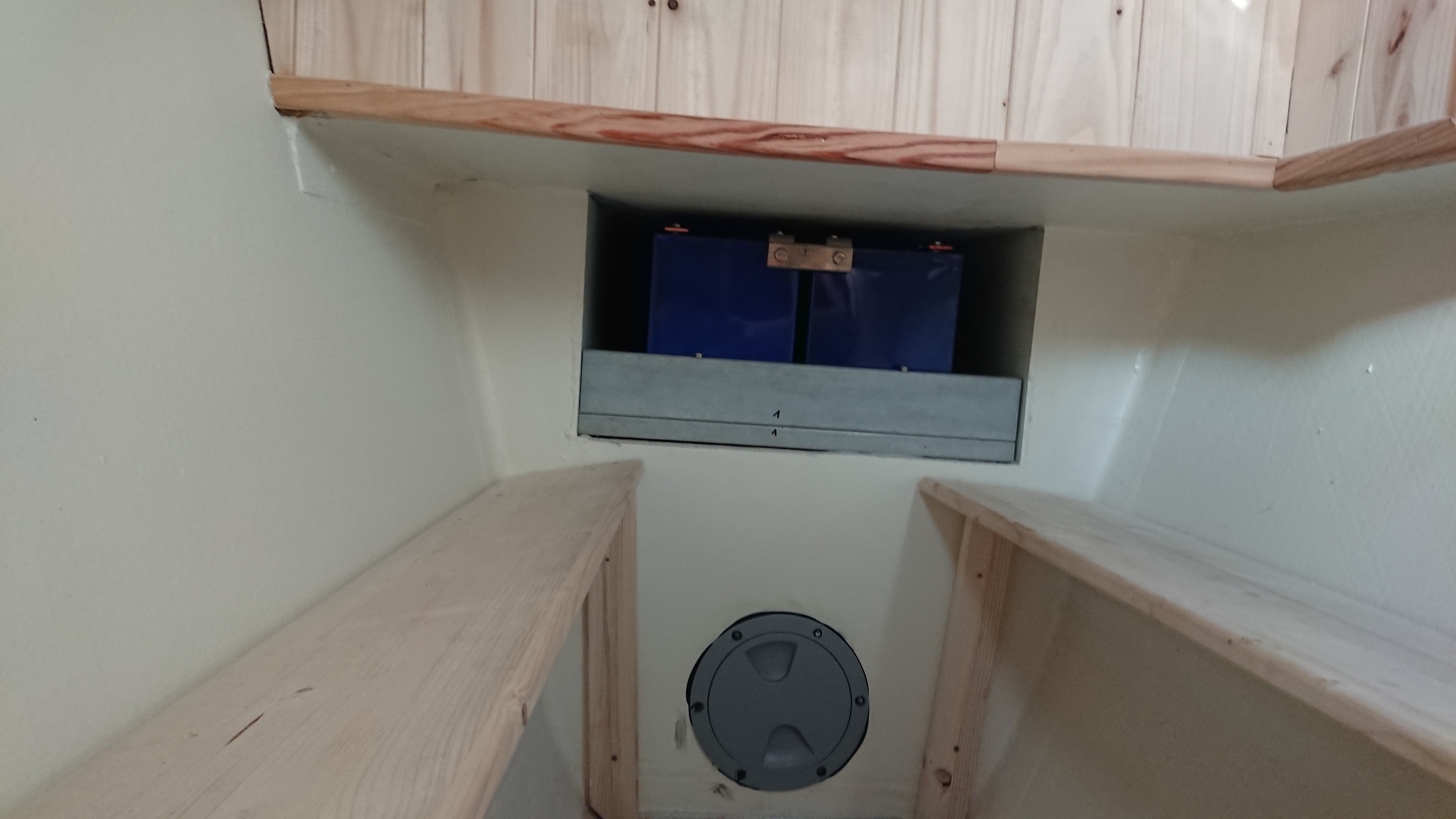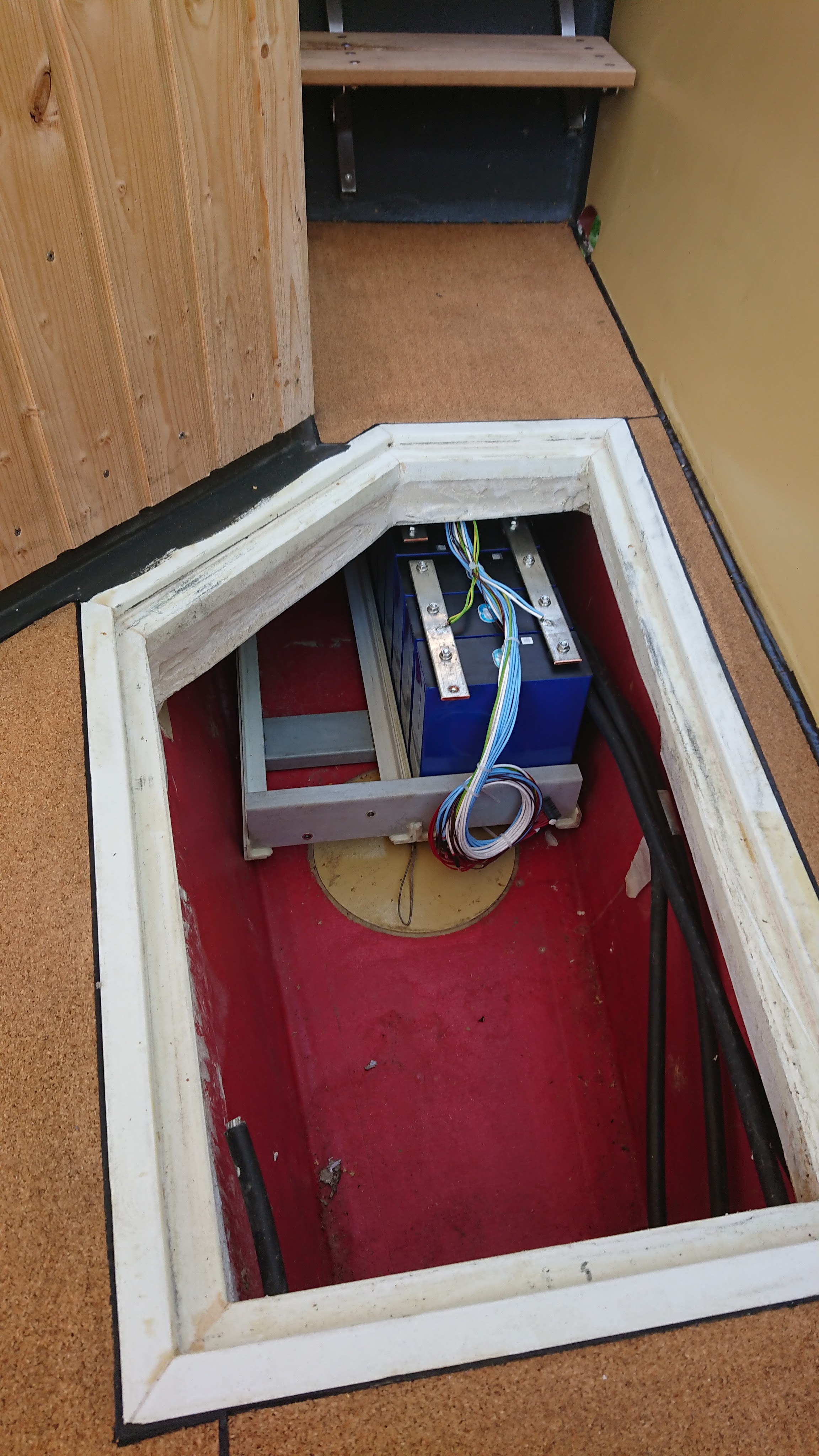 Installation des cellules lithium Fer sur des rails qui viennent se glisser dans les flotteurs sous le plancher à l’avant du bateau. Il y a deux batteries de 48 kwh chacune. Pour équilibrer le bateau les batteries sont installée tout à l’avant et les moteurs plutôt à l’arrière. Passer les 4 câbles en aluminium de 70 mm2 dans les coques n’a pas été une mince affaire.