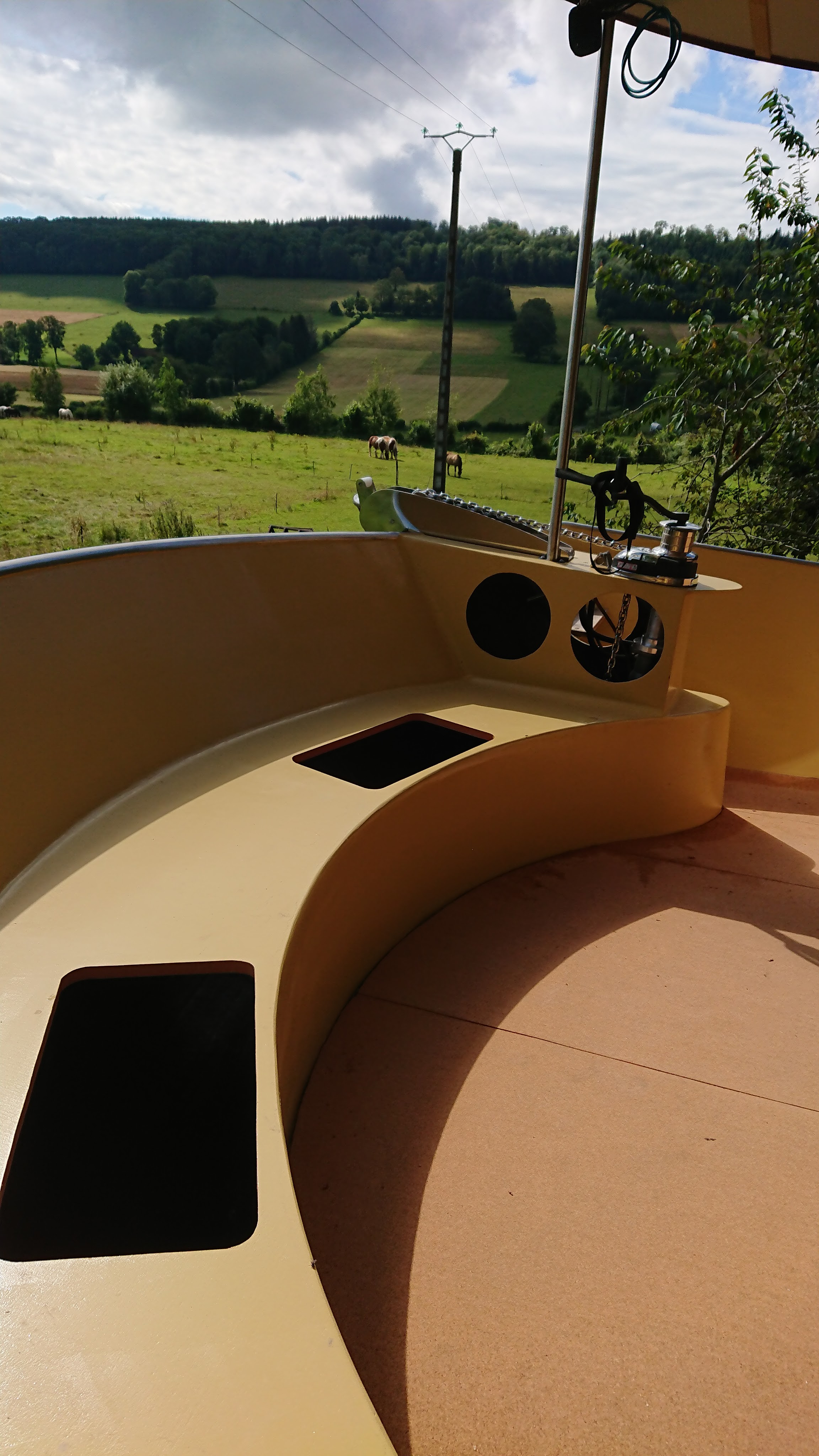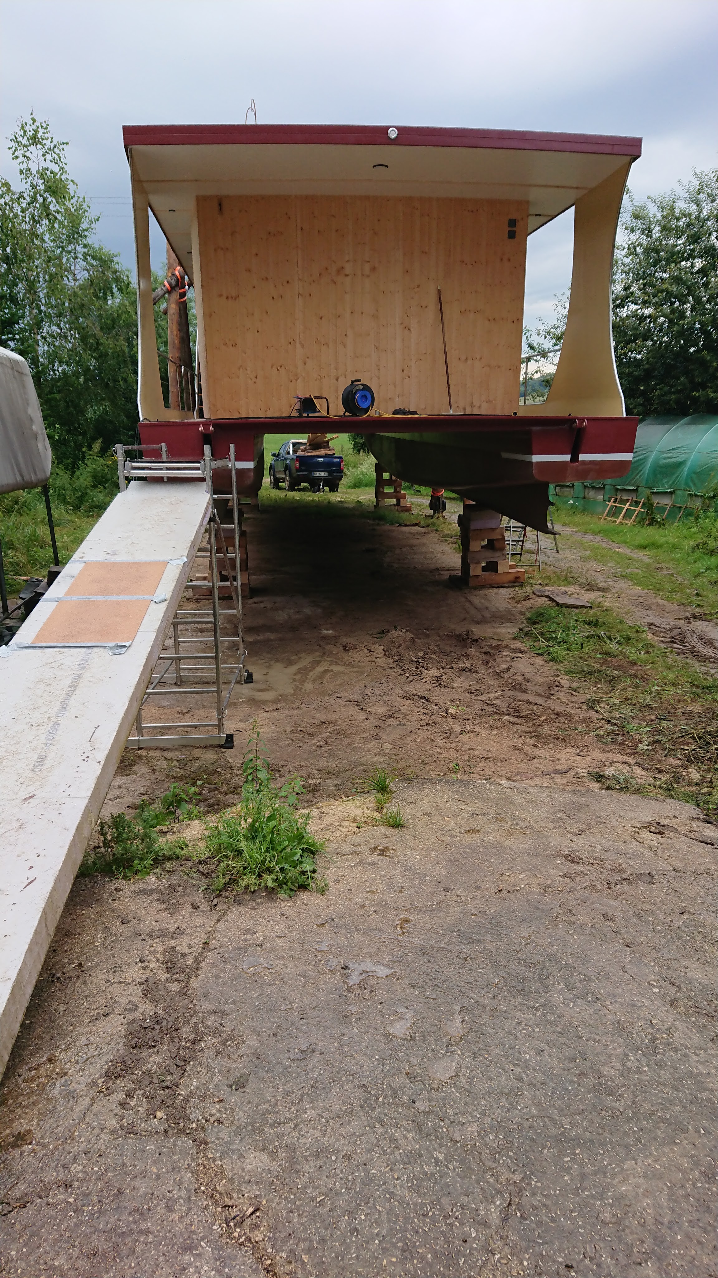 Elle est relevable par vérins hydraulique, elle va être utilisée pour sortir la voiture du bateau mais aussi pour se baigner ou comme grande terrasse.