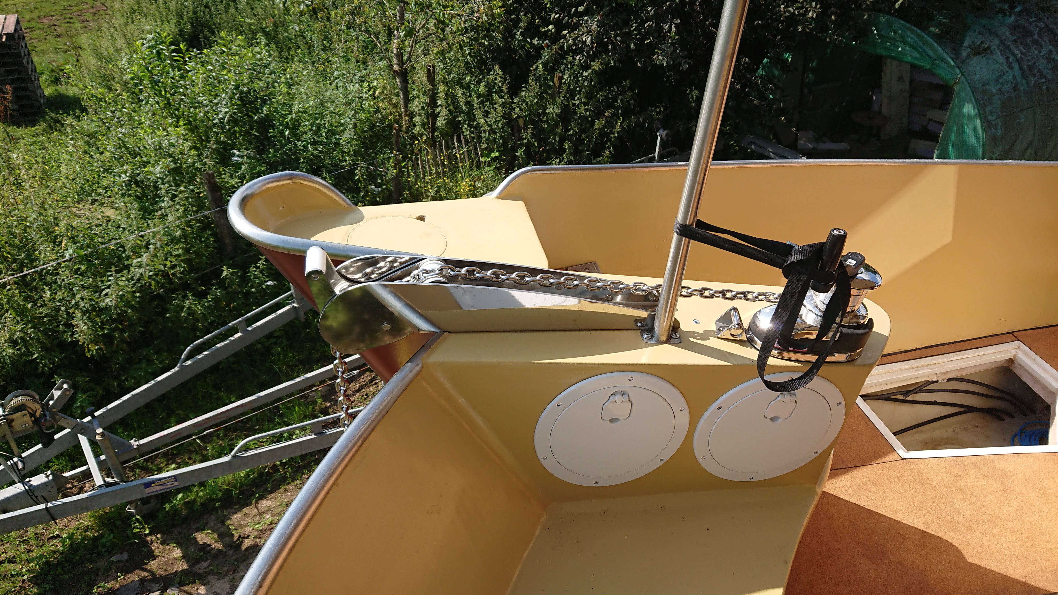 Installation de l’ancre Spade sur guindeau hydraulique. Elle n’est pas trop lourde et il parait qu’elle a une bonne tenue sur toute sorte de fonds marins. A voir…