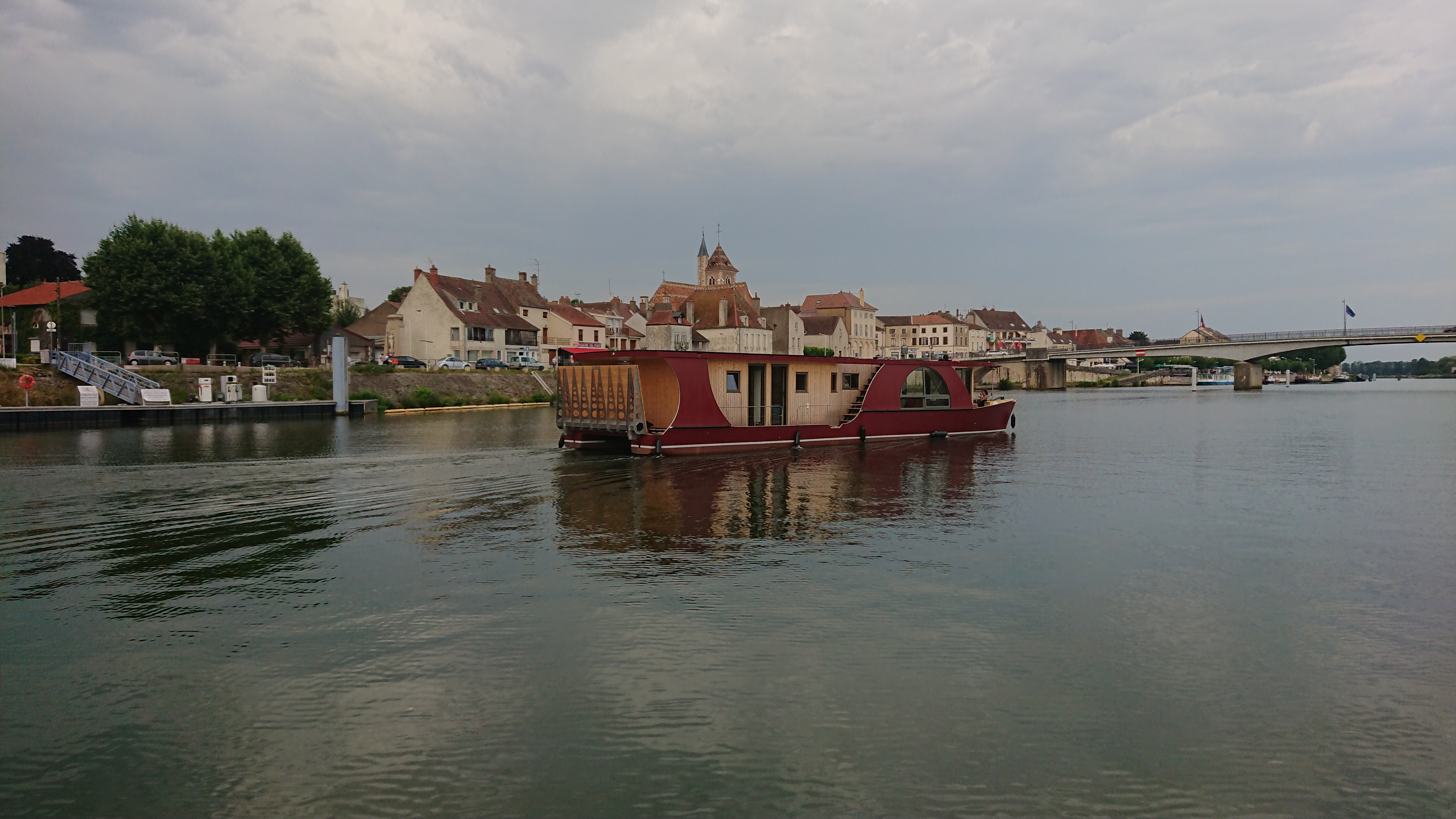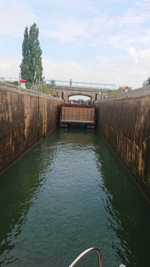 Mmmh, ce n’est pas évident de prendre une écluse avec un bateau qui navigue en crabe et il serait dommage d’abimer la peinture toute neuve sur les premiers bajoyers rencontrés. Fort heureusement, il y a pleins de bras pour pousser et tirer. Nous voici sur la Saône et comme à chaque fois, à la sortie de l’écluse, que se soit du canal de Bourgogne ou du Rhône au Rhin un petit sentiment de liberté nous envahi.