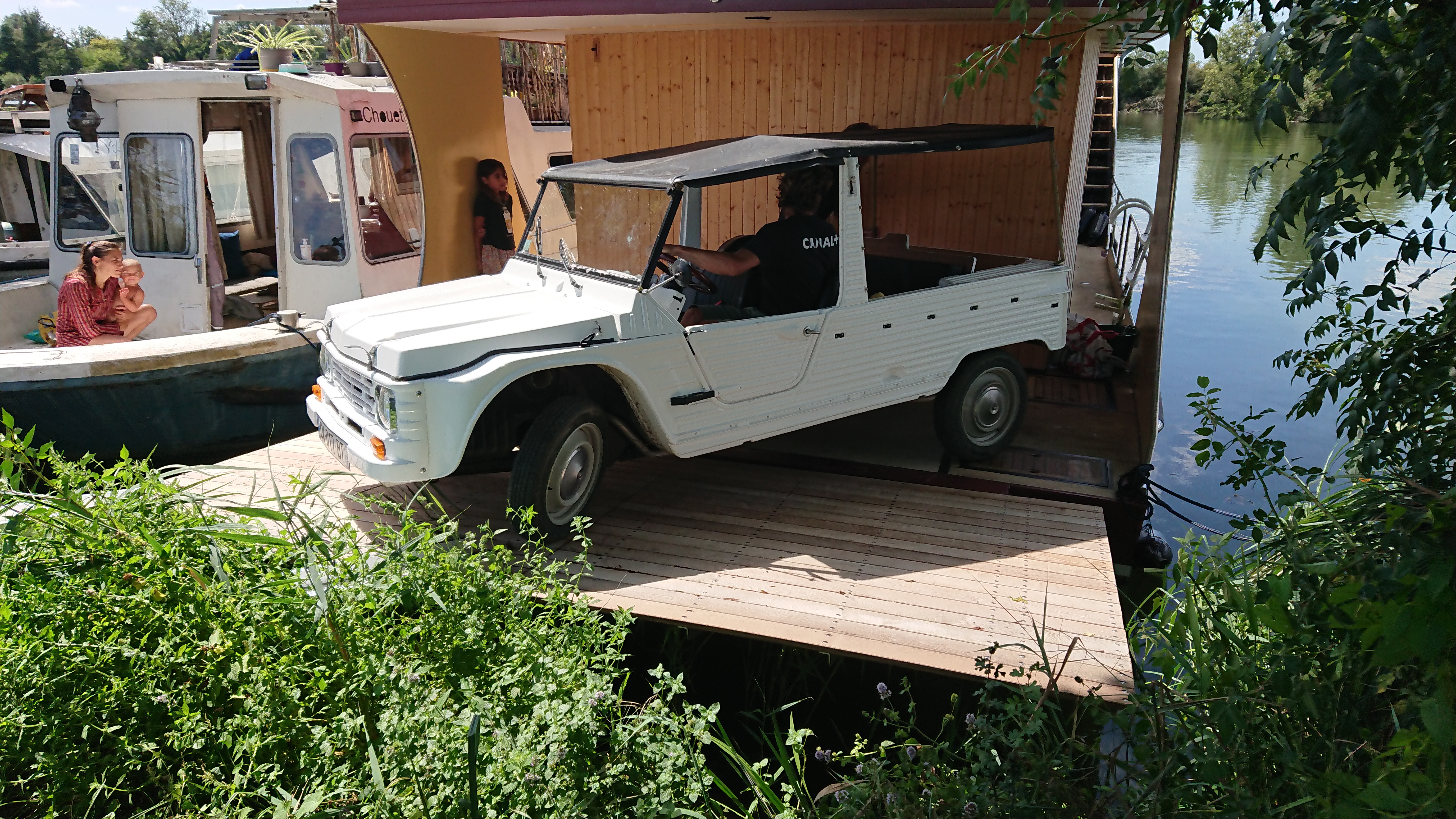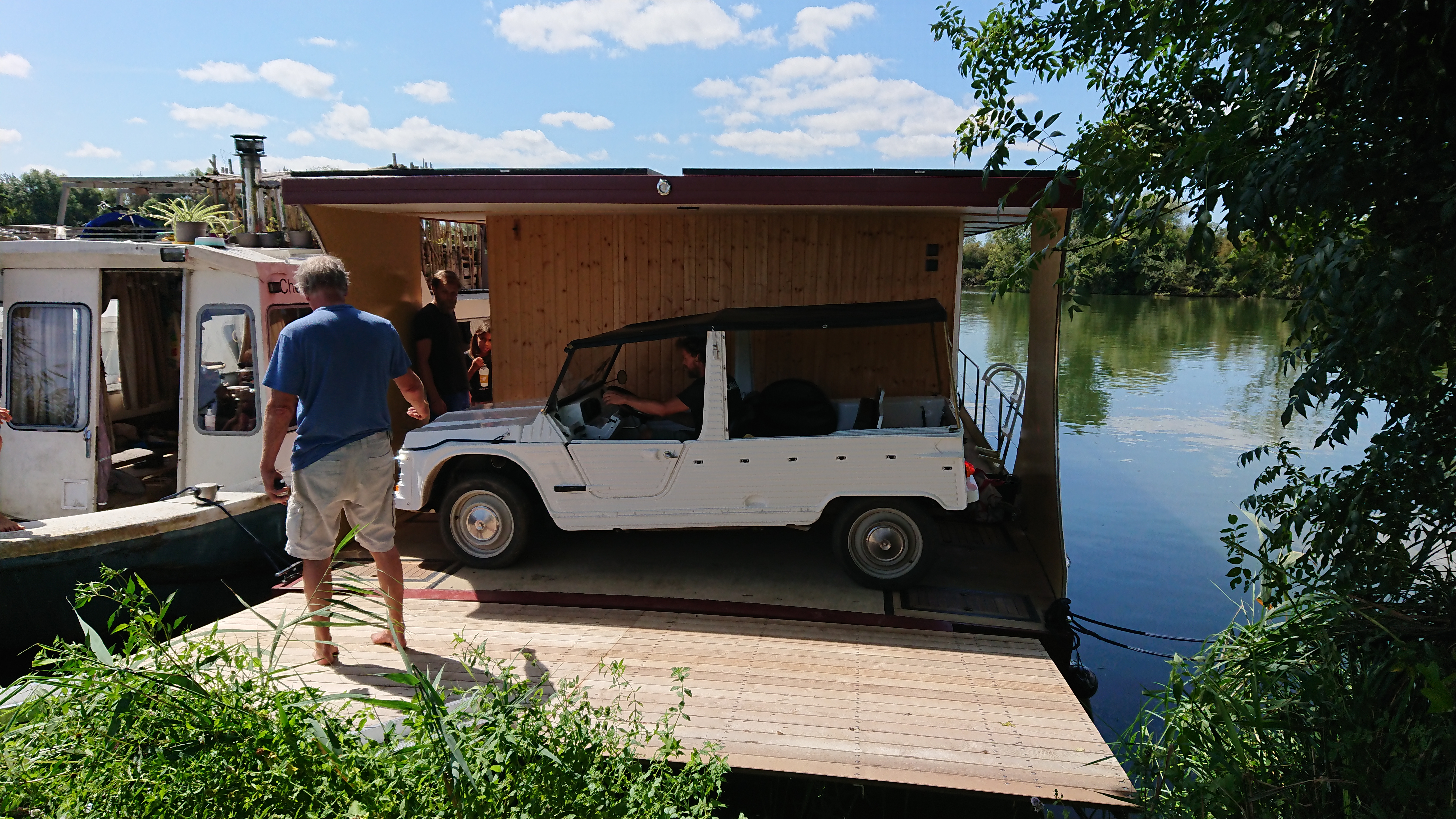 A l’aide de deux rampes en alu, le chargement et déchargement de la méhari se passe relativement facilement. Il faut un peu manoeuvrer ou plus simplement, soulever l’arrière de la voiture pour la ranger à sa place.